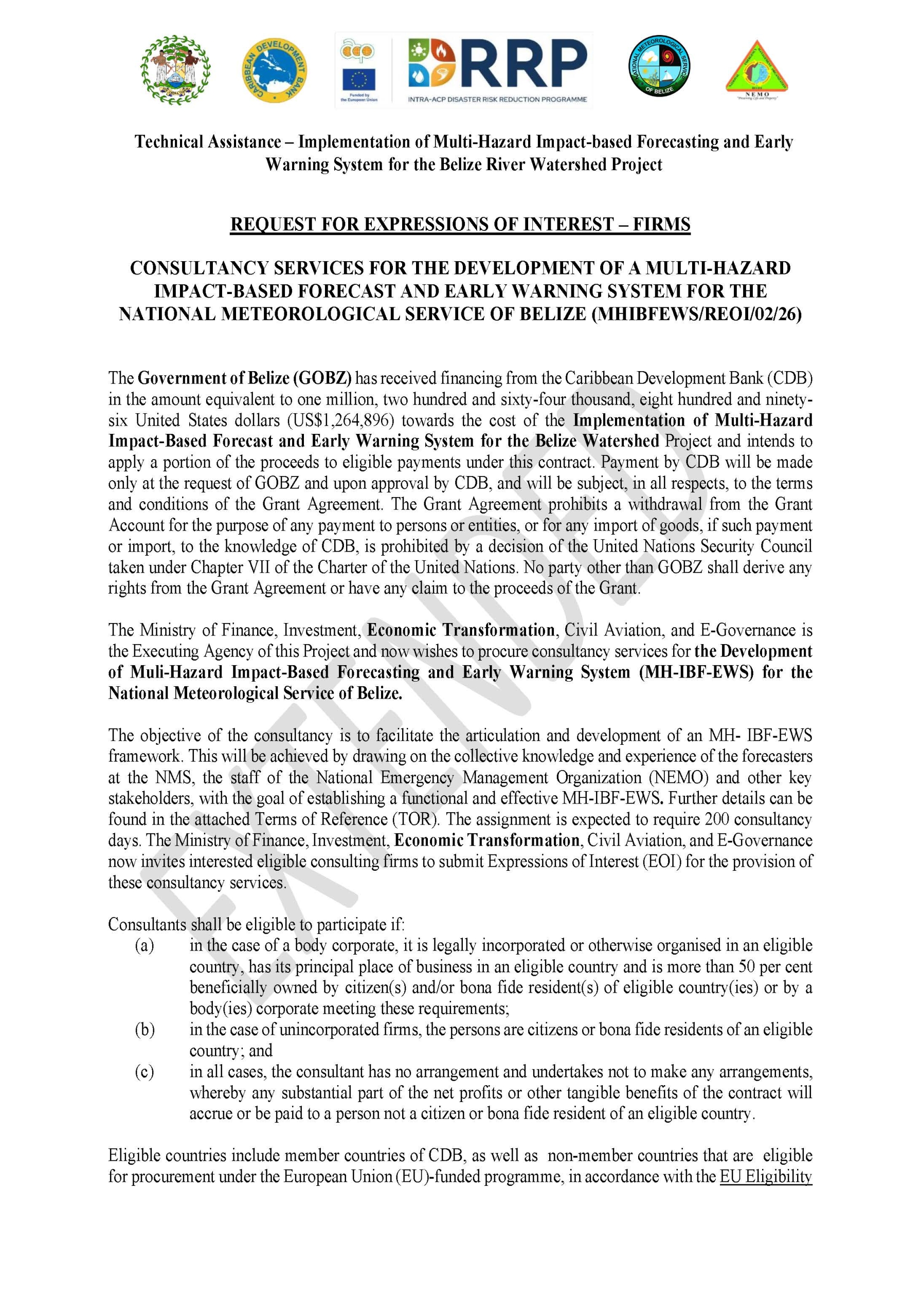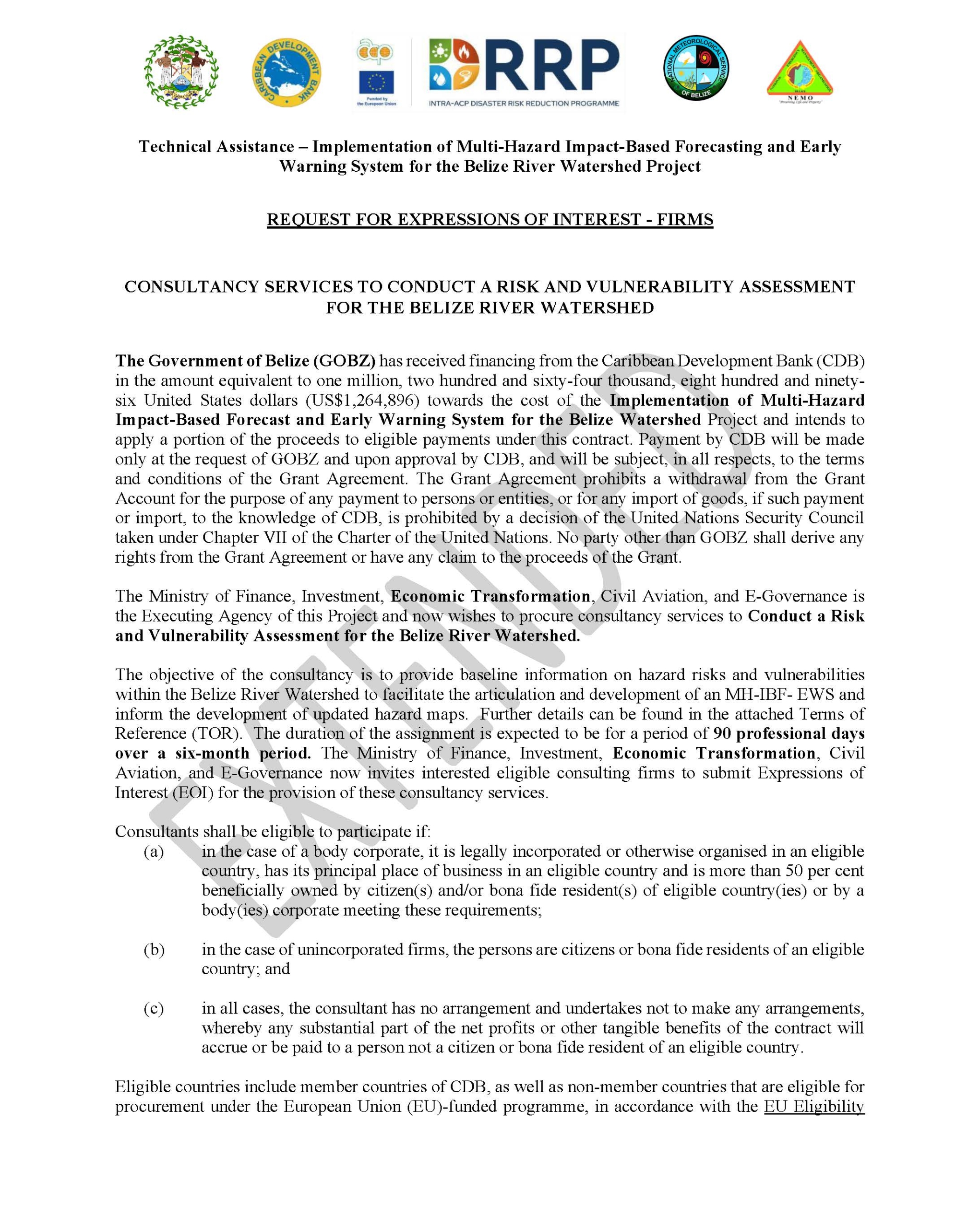View Larger Image AMENDMENT No. 1 m3d@dmin2024-06-13T15:57:36+00:00June 13th, 2024|BISP, CABEI, Consultancy Services, Ministry of Economic Development, Notices| Share This Notification FacebookTwitterLinkedInWhatsAppEmail Related Posts Consultancy Services For The Development Of MHIBFEWS – FIRMS April 10th, 2026 | 0 Comments Consultancy Services To Conduct A Risk And Vulnerability Assessment For The Belize Watershed – FIRMS April 10th, 2026 | 0 Comments Consultancy Services Production of Audio and Video Adverts To Support Tsunami Awareness Campaign March 26th, 2026 | 0 Comments