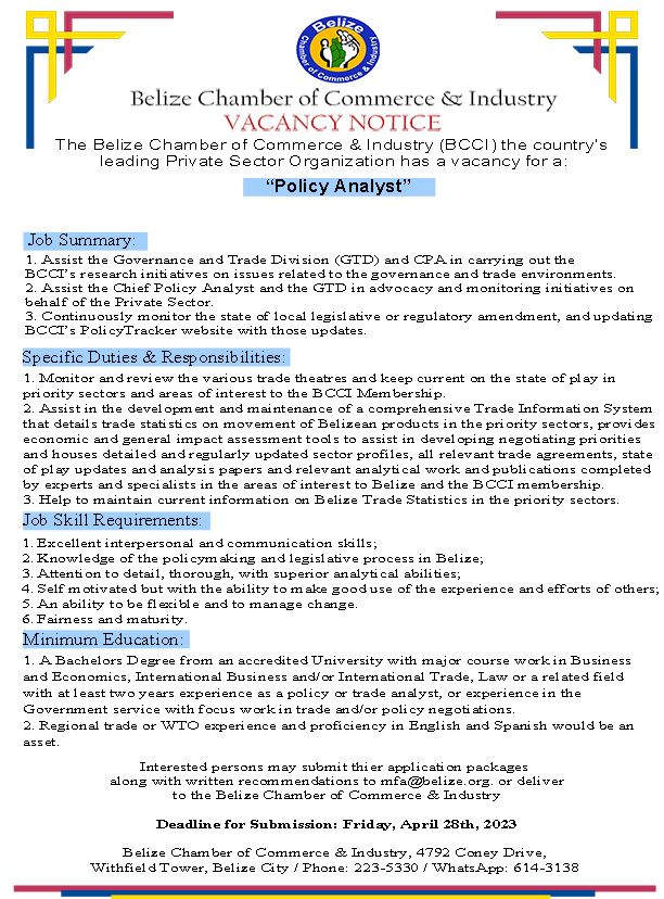 The Belize Chamber of Commerce & Industry is seeking a motivated and qualified Policy Analyst to assist the Government and Trade Division (GTD) and Chief policy Analyst (CPA) in carrying out the BCCI’s research initiatives on issues related to the governance and trade environments, among other duties.