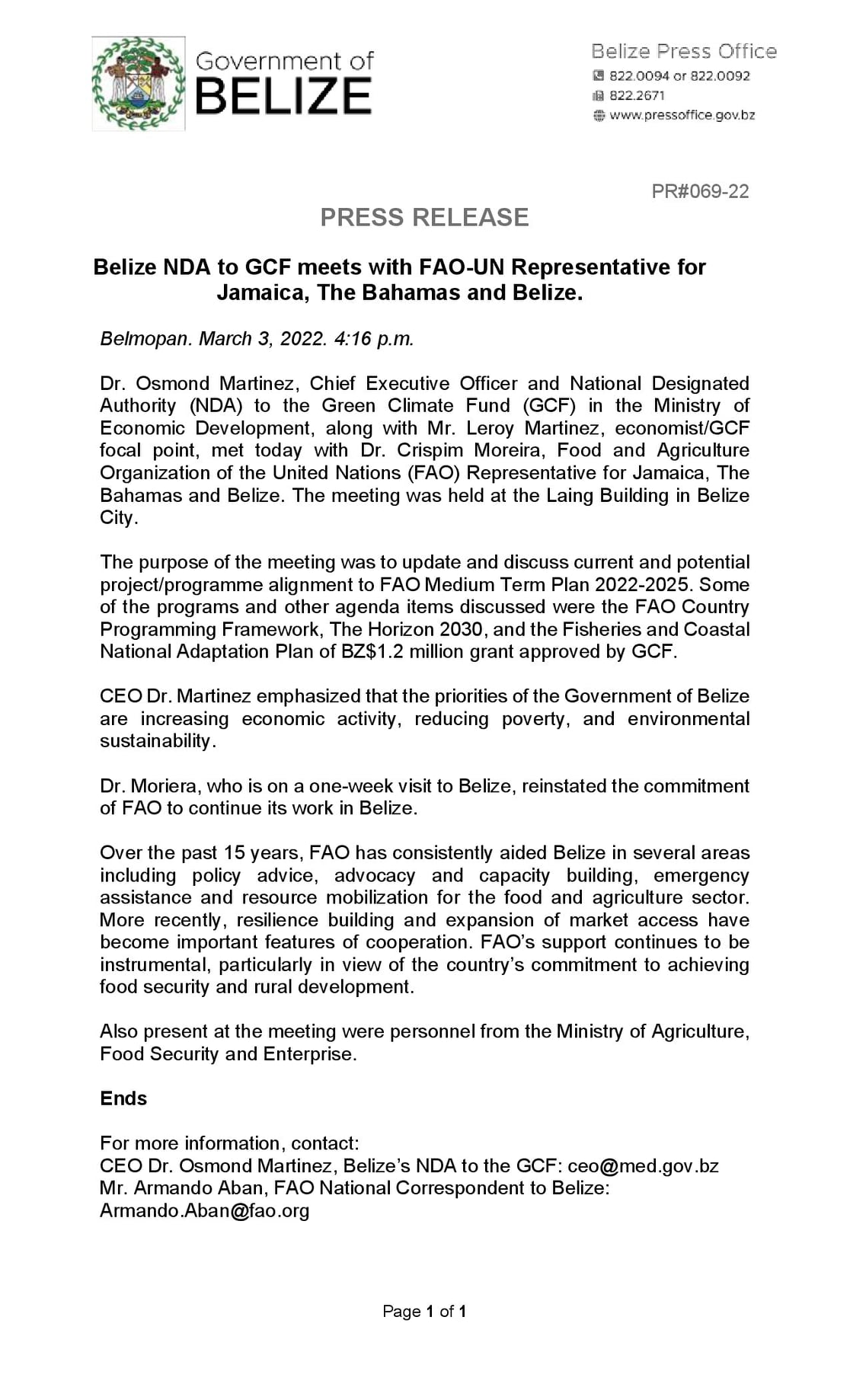 Belize NDA to GCF meets with FAO-UN Representative for Jamaica, The Bahamas, and Belize.