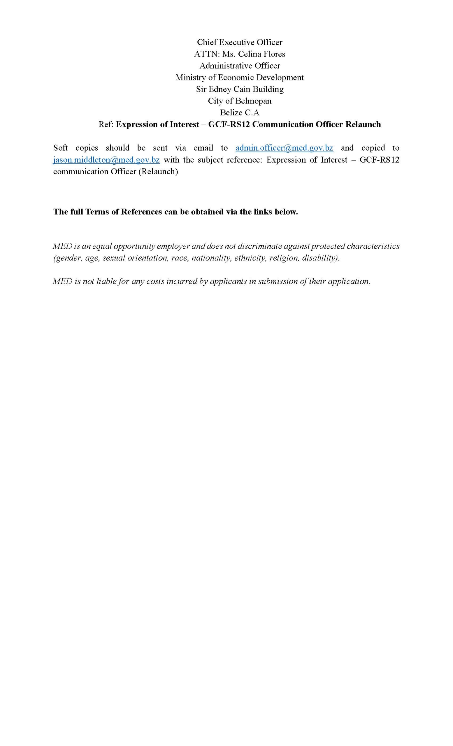 (Individual - Local Consultant) Communications Officer GCF Project BLZ-RS-012 TITLE