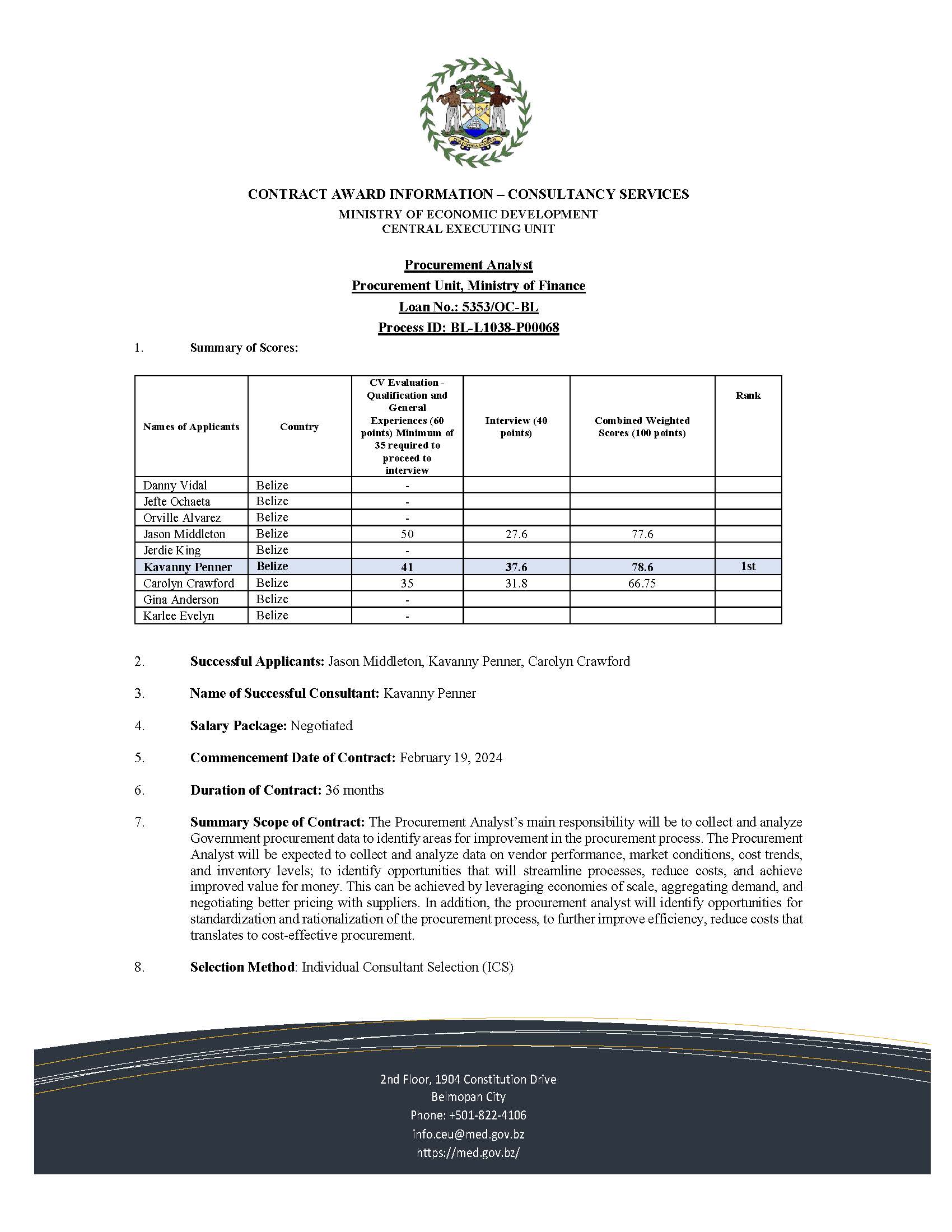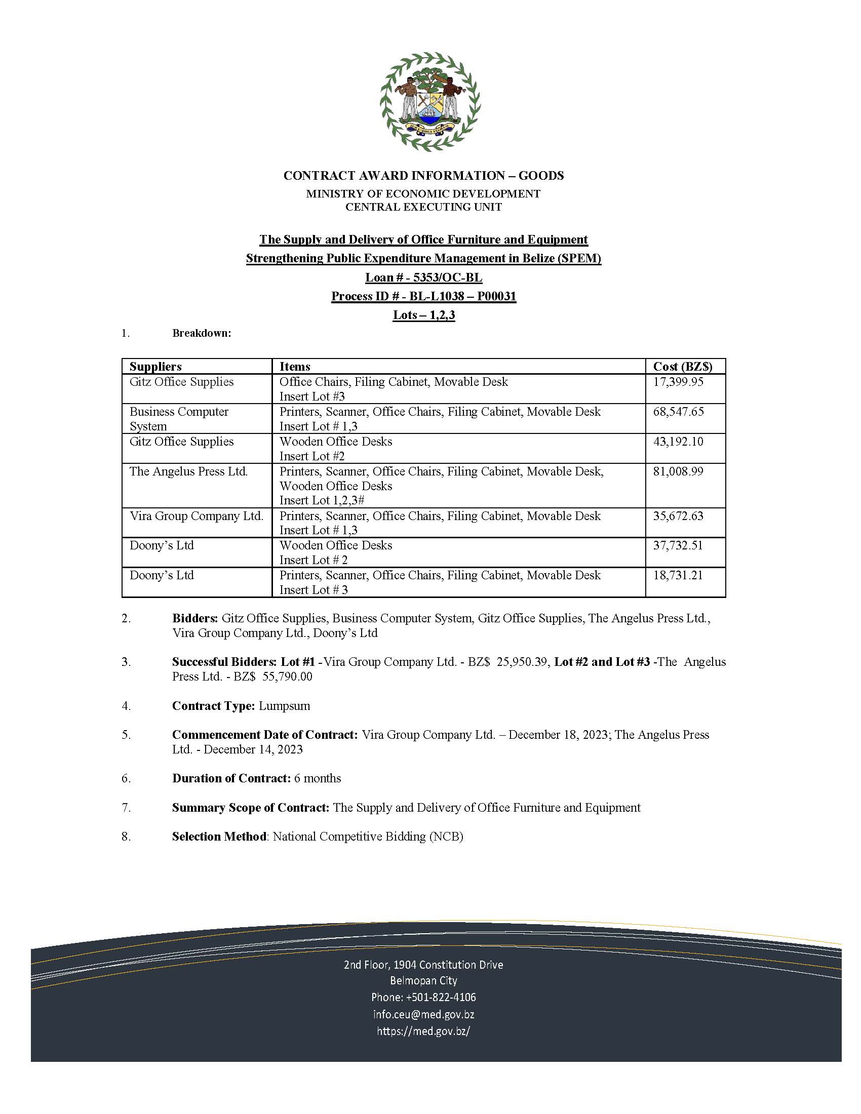 NOTIFICATION OF CONTRACT AWARD NOTIFICATION OF CONTRACT AWARD m3d@dmin2024-04-08T13:30:59+00:00April 8th, 2024|Belize Compact Development Program, Ministry of Economic Development, Notice Of Contract Award| Read More