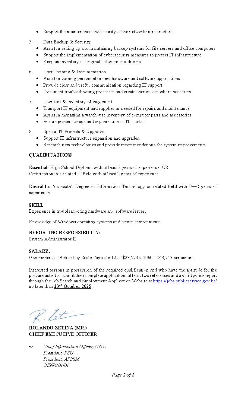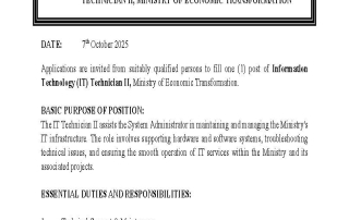 VACANCY NOTICE – ONE (1) POST OF INFORMATION TECHNOLOGY TECHNICIAN II, MINISTRY OF ECONOMIC TRANSFORMATION.