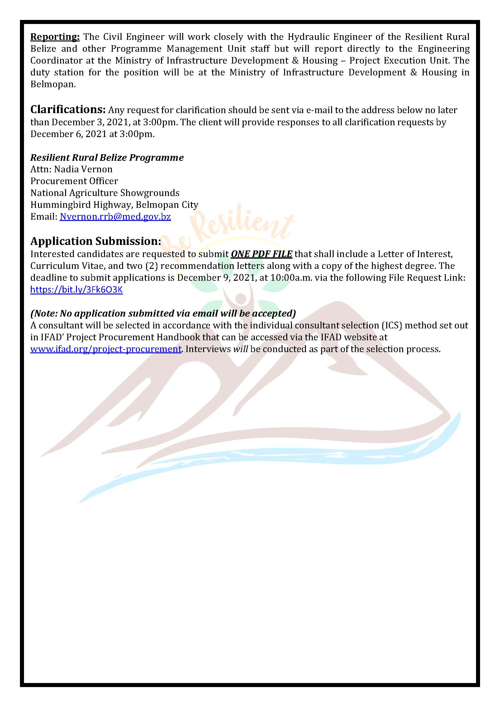 PROCUREMENT NOTICE – CIVIL ENGINEER PROCUREMENT NOTICE – CIVIL ENGINEER m3d@dmin2021-11-16T17:47:51+00:00November 16th, 2021|Resilient Rural Belize, Vacancies/Job Opportunities| Read More