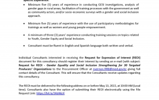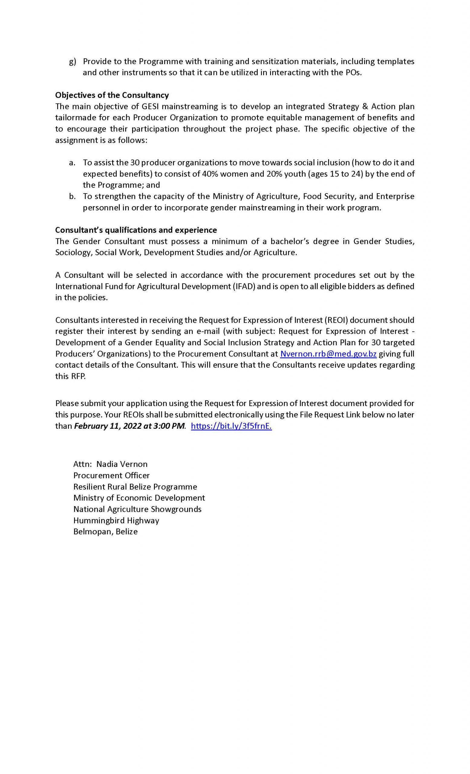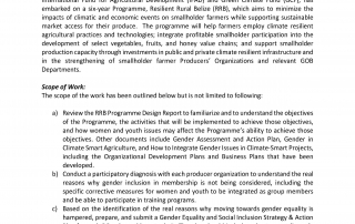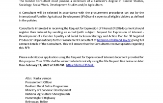 REQUEST FOR EXPRESSION OF INTEREST – Development of a Gender Equality and Social Inclusion Strategy and Action Plan for 30 targeted Producers’ Organizations REQUEST FOR EXPRESSION OF INTEREST – Development of a Gender Equality and Social Inclusion Strategy and Action Plan for 30 targeted Producers’ Organizations m3d@dmin2022-01-15T15:55:02+00:00January 15th, 2022|Economic Development, Resilient Rural Belize, Vacancies/Job Opportunities| Read More