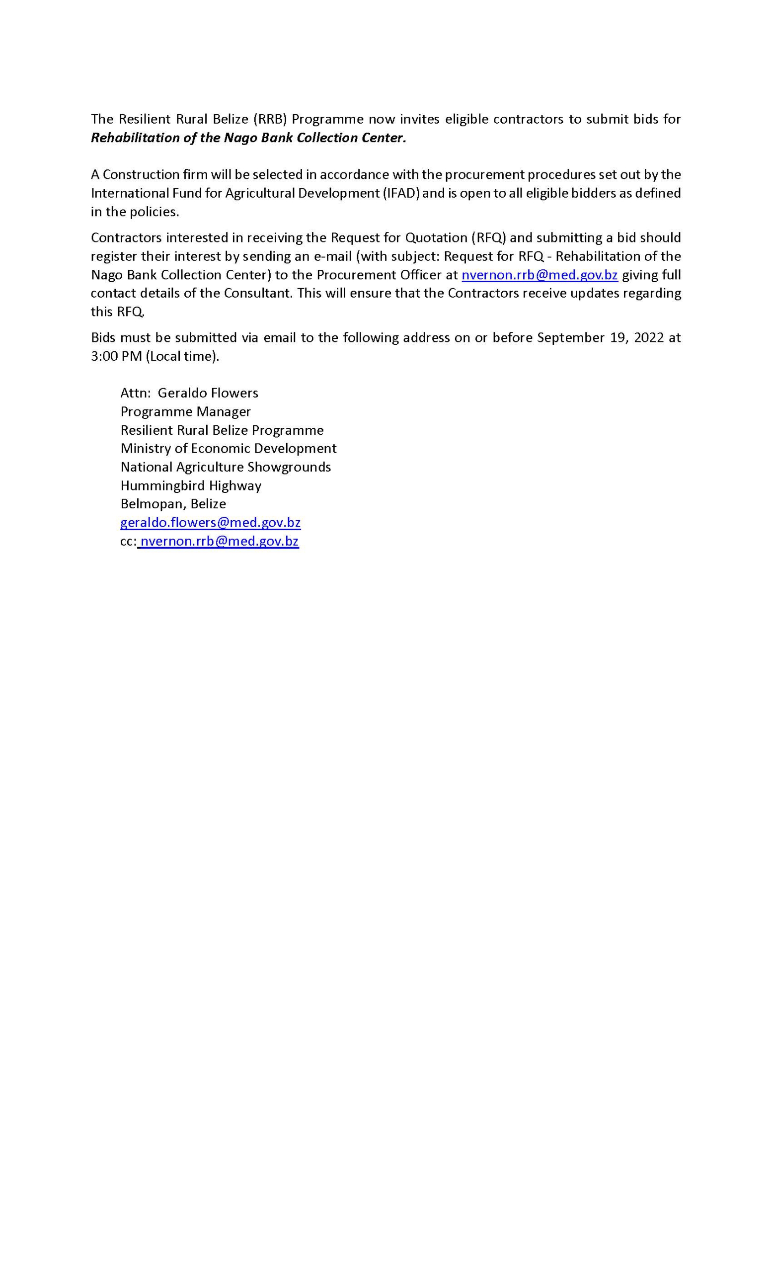 INVITATION TO BID – REHABILITATION OF NAGO BANK COLLECTION CENTER INVITATION TO BID – REHABILITATION OF NAGO BANK COLLECTION CENTER m3d@dmin2022-08-23T15:04:57+00:00August 23rd, 2022|Economic Development, Resilient Rural Belize| Read More
