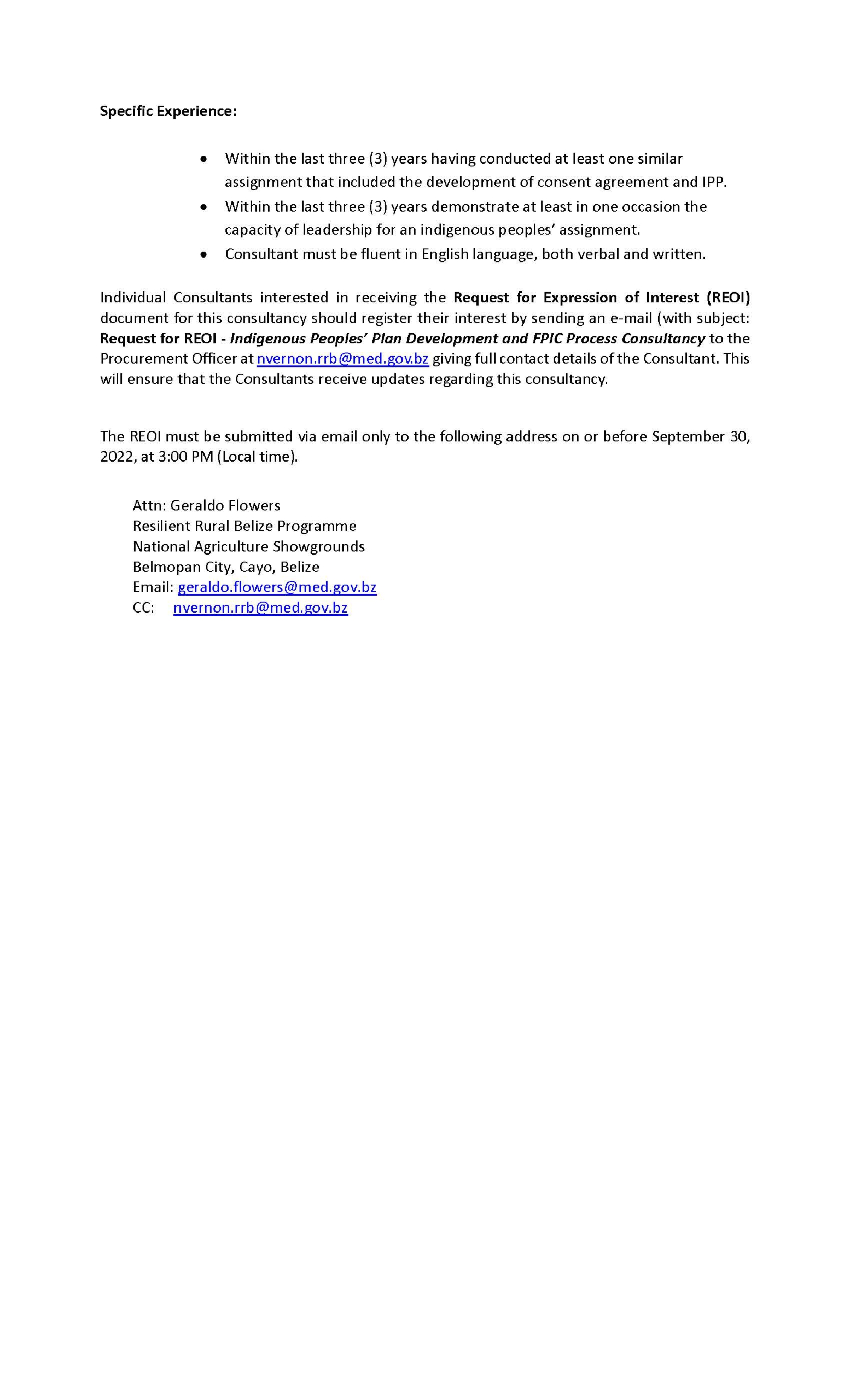 Request for Expression of Interest – INDIGENOUS PEOPLES’ PLAN DEVELOPMENT AND FPIC PROCESS CONSULTANCY Request for Expression of Interest – INDIGENOUS PEOPLES’ PLAN DEVELOPMENT AND FPIC PROCESS CONSULTANCY m3d@dmin2022-08-31T14:00:35+00:00August 31st, 2022|Resilient Rural Belize| Read More