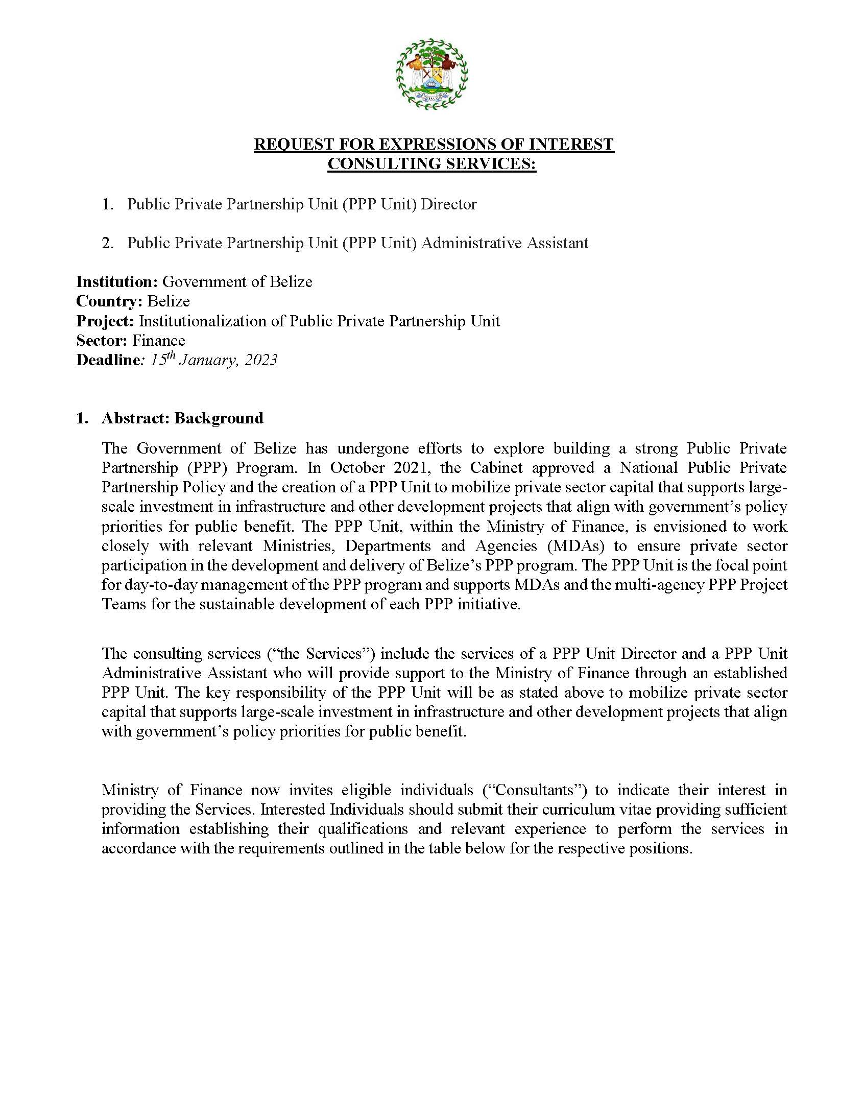 The Government of Belize (GOB) through the Ministry of Finance,