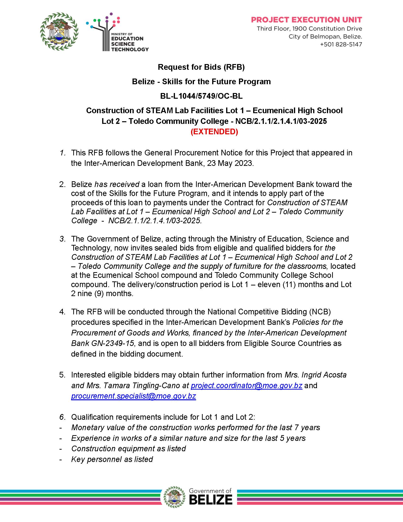 View Larger Image Construction of STEAM Lab Facilities Lot 1 – Ecumenical High School Lot 2 – Toledo Community College NCB/2.1.1/2.1.4.1/02-2025 (EXTENDED) Joel Ical2025-12-22T15:05:20+00:00December 22nd, 2025|Bid Opportunity| Share This Notification FacebookTwitterLinkedInWhatsAppEmail Related Posts GENERAL PROCUREMENT NOTICE (GPN) February 6th, 2026 | 0 Comments SPECIFIC PROCUREMENT NOTICE (SPN) February 6th, 2026 | 0 Comments Request for Bids – Specific Procurement Notice (North CCC and BMHS)extended January 30th, 2026 | 0 Comments