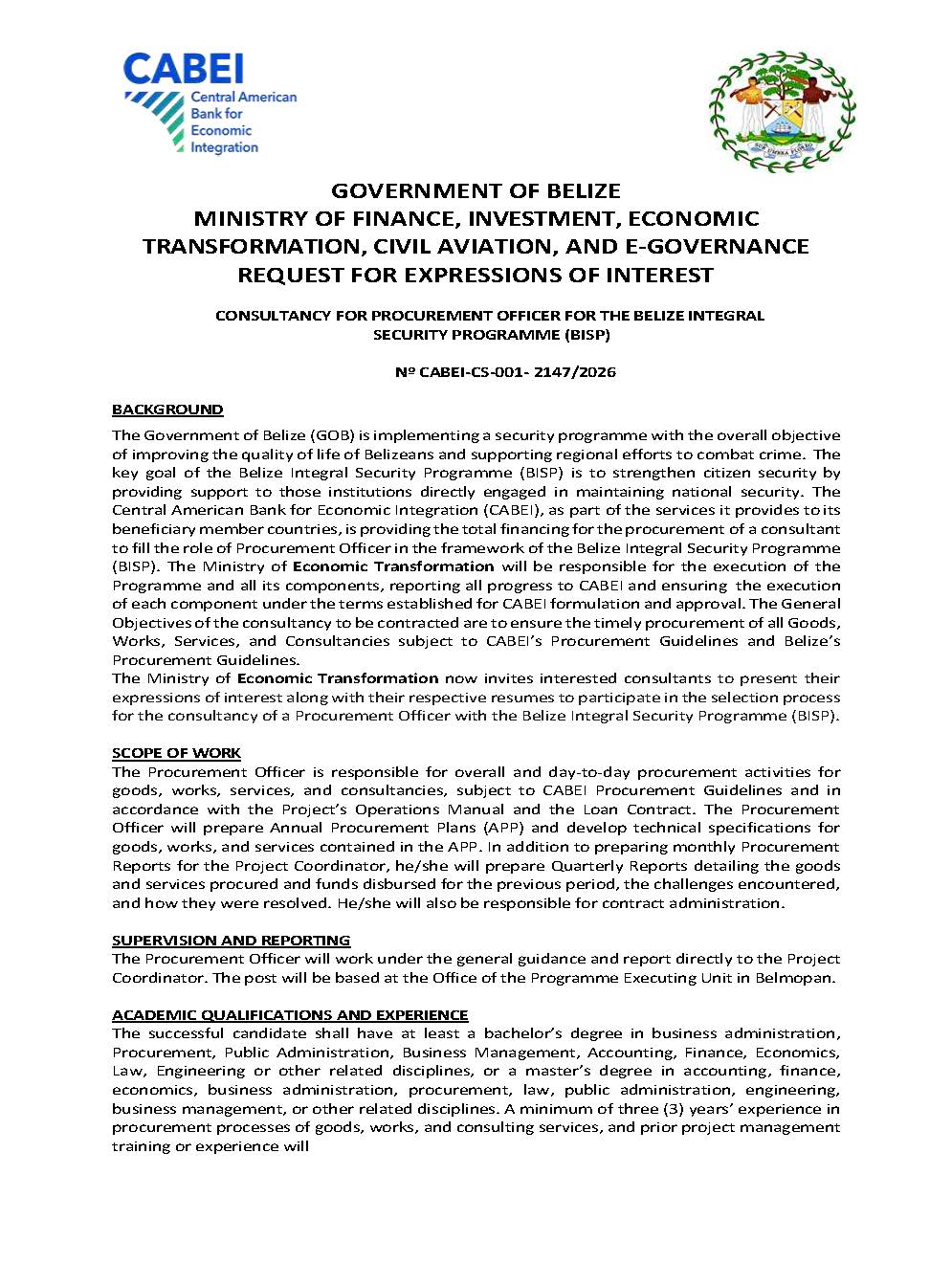 View Larger Image CONSULTANCY FOR PROCUREMENT OFFICER FOR THE BELIZE INTEGRAL SECURITY PROGRAMME (BISP) Joel Ical2026-01-25T13:36:52+00:00January 25th, 2026|BISP, CABEI, Consultancy Services, Economic Development, Ministry of Economic Transformation| Share This Notification FacebookTwitterLinkedInWhatsAppEmail Related Posts Response to Request for Clarification No. 1(MHIBFEWS.REOI.01.26) February 10th, 2026 | 0 Comments GENERAL PROCUREMENT NOTICE (GPN) February 6th, 2026 | 0 Comments SPECIFIC PROCUREMENT NOTICE (SPN) February 6th, 2026 | 0 Comments