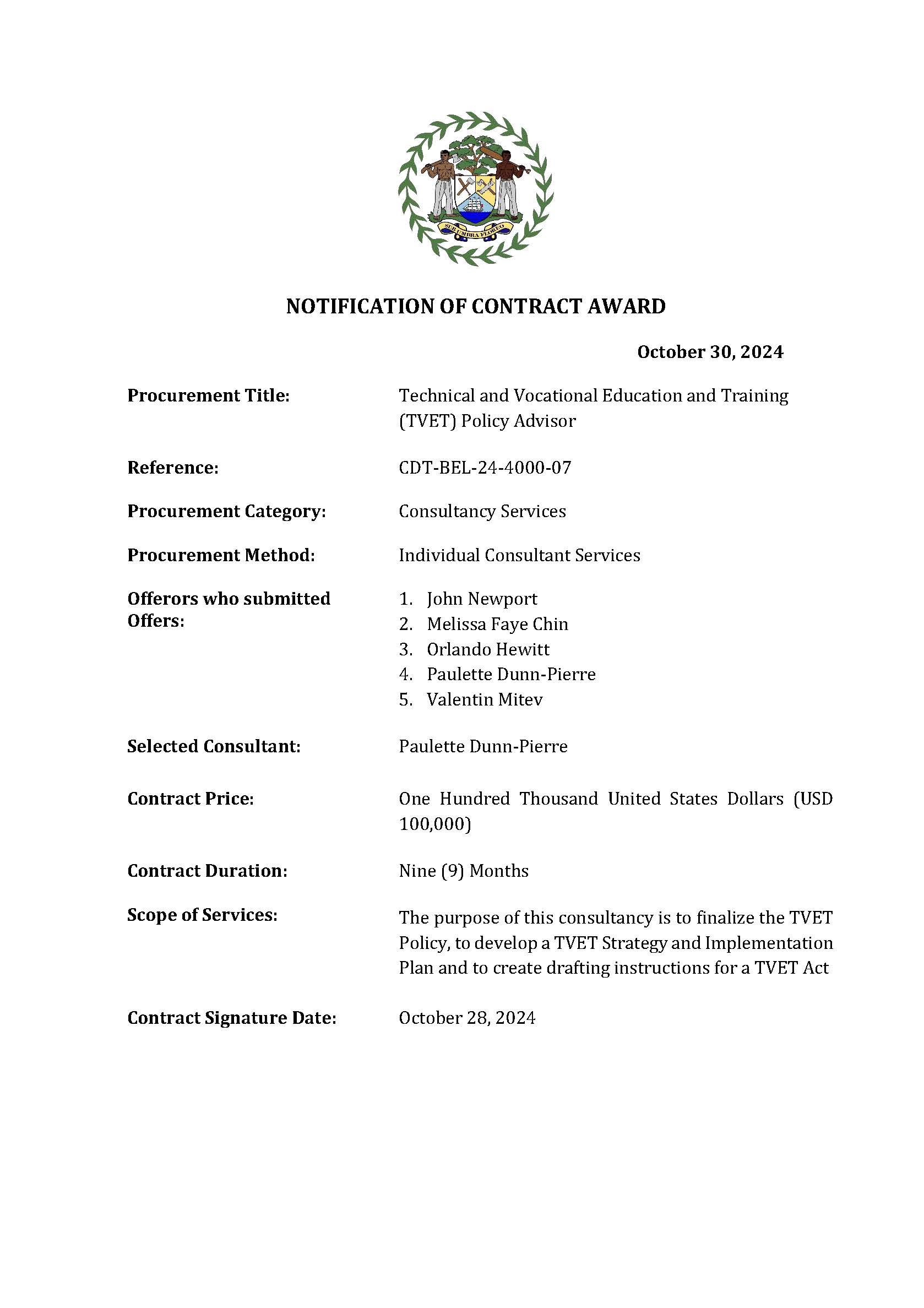 View Larger Image Contract Award Notice -TVET Policy Advisor m3d@dmin2024-10-30T20:34:51+00:00October 30th, 2024|Belize Compact Development Program, Economic Development, Ministry of Economic Development, Notice Of Contract Award, Notices| Share This Notification FacebookTwitterLinkedInWhatsAppEmail Related Posts Response to Request for Clarification No. 1(MHIBFEWS.REOI.01.26) February 10th, 2026 | 0 Comments GENERAL PROCUREMENT NOTICE (GPN) February 6th, 2026 | 0 Comments SPECIFIC PROCUREMENT NOTICE (SPN) February 6th, 2026 | 0 Comments