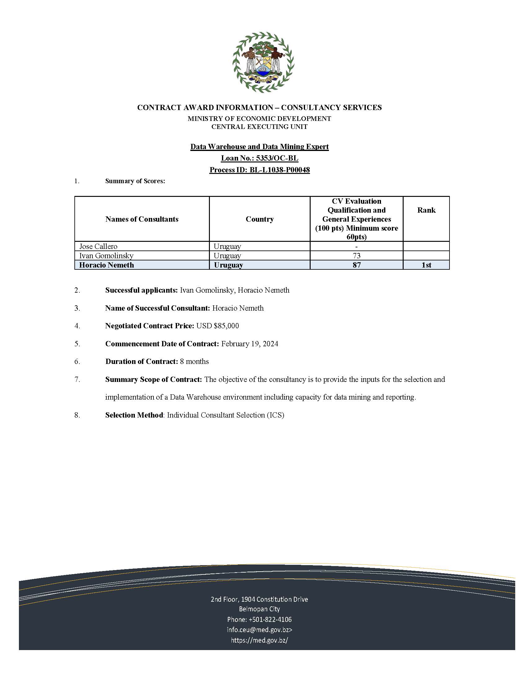 View Larger Image CONTRACT AWARD NOTICES m3d@dmin2024-02-23T14:44:42+00:00February 23rd, 2024|Central Executing Unit, Economic Development, Notice Of Contract Award| Share This Notification FacebookTwitterLinkedInWhatsAppEmail Related Posts CONSULTANCY FOR PROCUREMENT OFFICER FOR THE BELIZE INTEGRAL SECURITY PROGRAMME (BISP) January 25th, 2026 | 0 Comments REQUEST FOR EXPRESSIONS OF INTEREST – Consulting Firm December 29th, 2025 | 0 Comments REQUEST FOR EXPRESSIONS OF INTEREST – FIRMS November 17th, 2025 | 0 Comments
