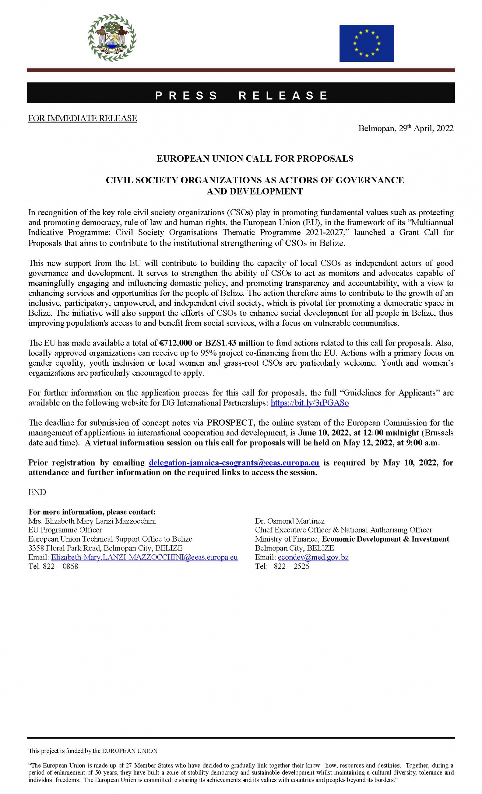 View Larger Image EUROPEAN UNION – CALL FOR PROPOSALS CIVIL SOCIETY ORGANIZATIONS AS ACTORS OF GOVERNANCE AND DEVELOPMENT m3d@dmin2022-04-30T14:37:26+00:00April 30th, 2022|Economic Development, Press Release| Share This Notification FacebookTwitterLinkedInWhatsAppEmail Related Posts CONSULTANCY FOR PROCUREMENT OFFICER FOR THE BELIZE INTEGRAL SECURITY PROGRAMME (BISP) January 25th, 2026 | 0 Comments REQUEST FOR EXPRESSIONS OF INTEREST – Consulting Firm December 29th, 2025 | 0 Comments REQUEST FOR EXPRESSIONS OF INTEREST – FIRMS November 17th, 2025 | 0 Comments