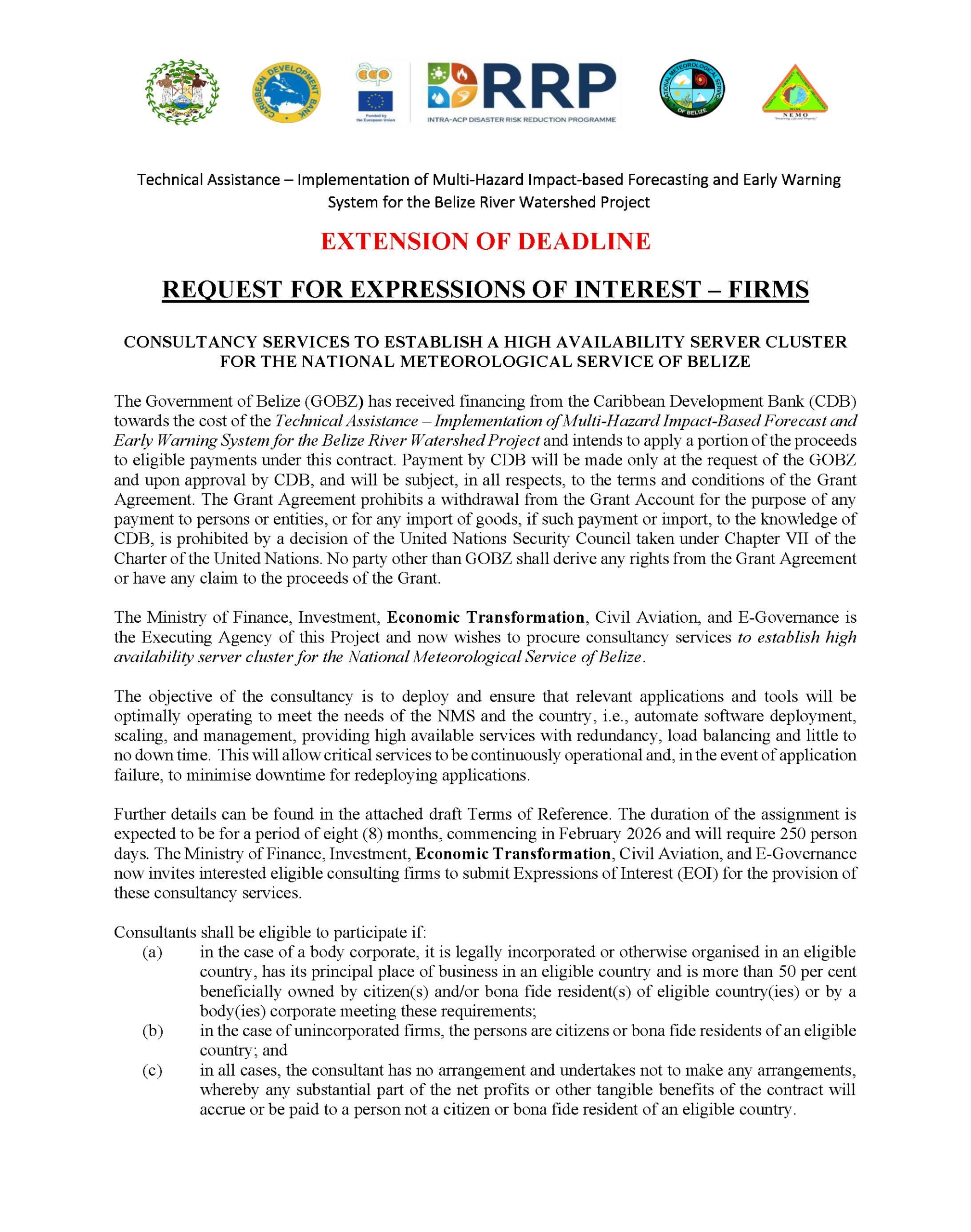 View Larger Image EXTENSION OF DEADLINE – REQUEST FOR EXPRESSIONS OF INTEREST – FIRMS Click the link to download the document. Joel Ical2025-12-13T23:07:15+00:00December 13th, 2025|Climate Finance Unit, Consultancy Services, Ministry of Economic Transformation, Notices| Share This Notification FacebookTwitterLinkedInWhatsAppEmail Related Posts Response to Request for Clarification No. 1(MHIBFEWS.REOI.01.26) February 10th, 2026 | 0 Comments GENERAL PROCUREMENT NOTICE (GPN) February 6th, 2026 | 0 Comments SPECIFIC PROCUREMENT NOTICE (SPN) February 6th, 2026 | 0 Comments