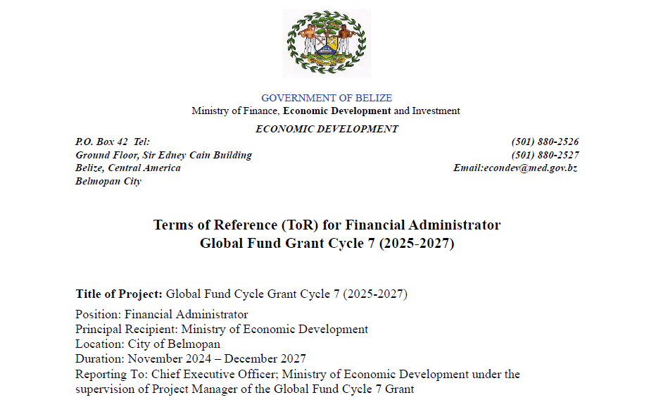 View Larger Image Financial Administrator Global Fund Grant Cycle 7 (2025-2027) Click on the link to download TOR. m3d@dmin2024-11-04T21:28:15+00:00November 4th, 2024|Consultancy Services, Global Fund, Ministry of Economic Development, Vacancies/Job Opportunities| Share This Notification FacebookTwitterLinkedInWhatsAppEmail Related Posts Response to Request for Clarification No. 1(MHIBFEWS.REOI.01.26) February 10th, 2026 | 0 Comments REQUEST FOR EXPRESSIONS OF INTEREST – FIRMS January 28th, 2026 | 0 Comments CONSULTANCY FOR PROCUREMENT OFFICER FOR THE BELIZE INTEGRAL SECURITY PROGRAMME (BISP) January 25th, 2026 | 0 Comments