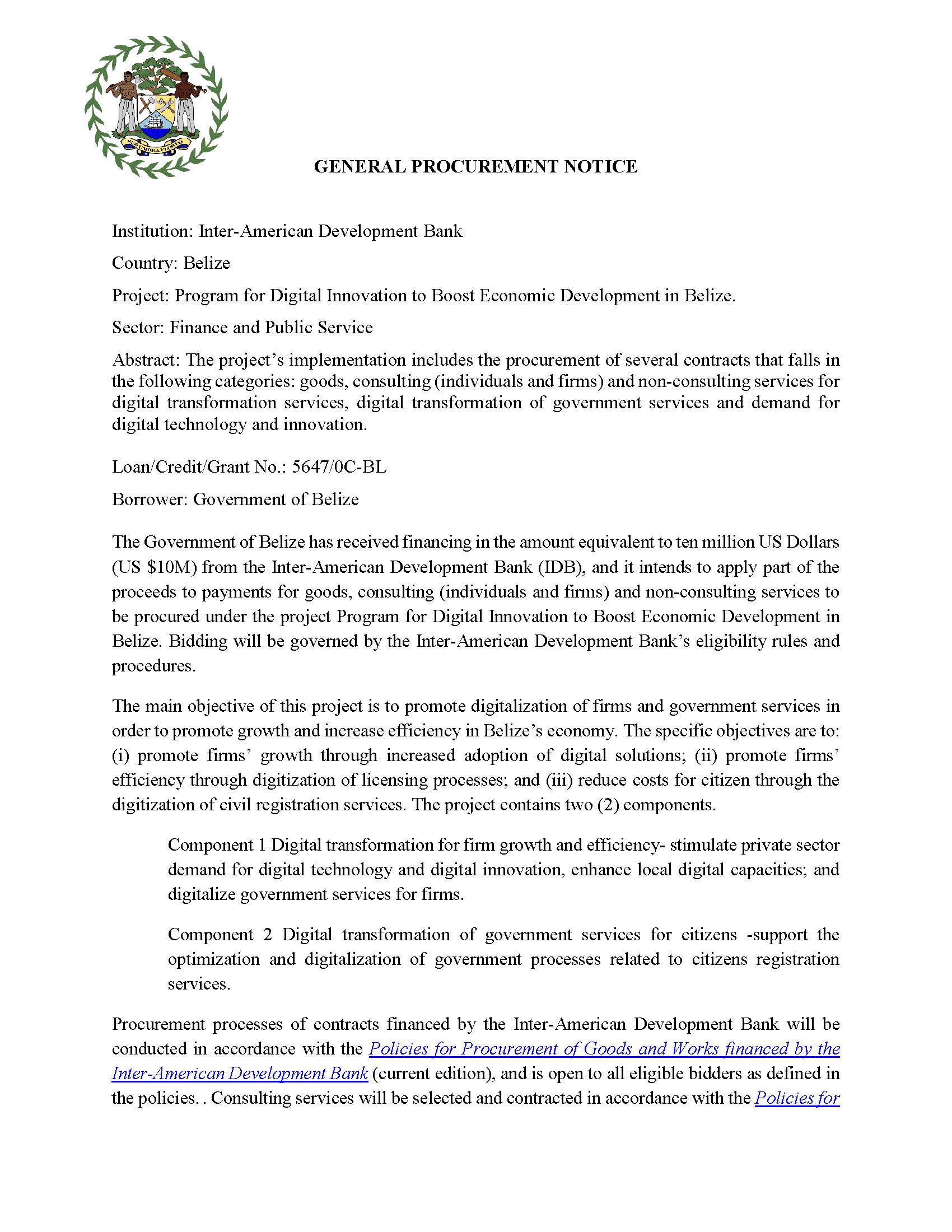 The Government of Belize has received financing in the amount equivalent to ten million US Dollars (US $10M) from the Inter-American Development Bank (IDB), and it intends to apply part of the proceeds to payments for goods, consulting (individuals and firms) and non-consulting services to be procured under the project Program for Digital Innovation to Boost Economic Development in Belize. Bidding will be governed by the Inter-American Development Bank’s eligibility rules and procedures.