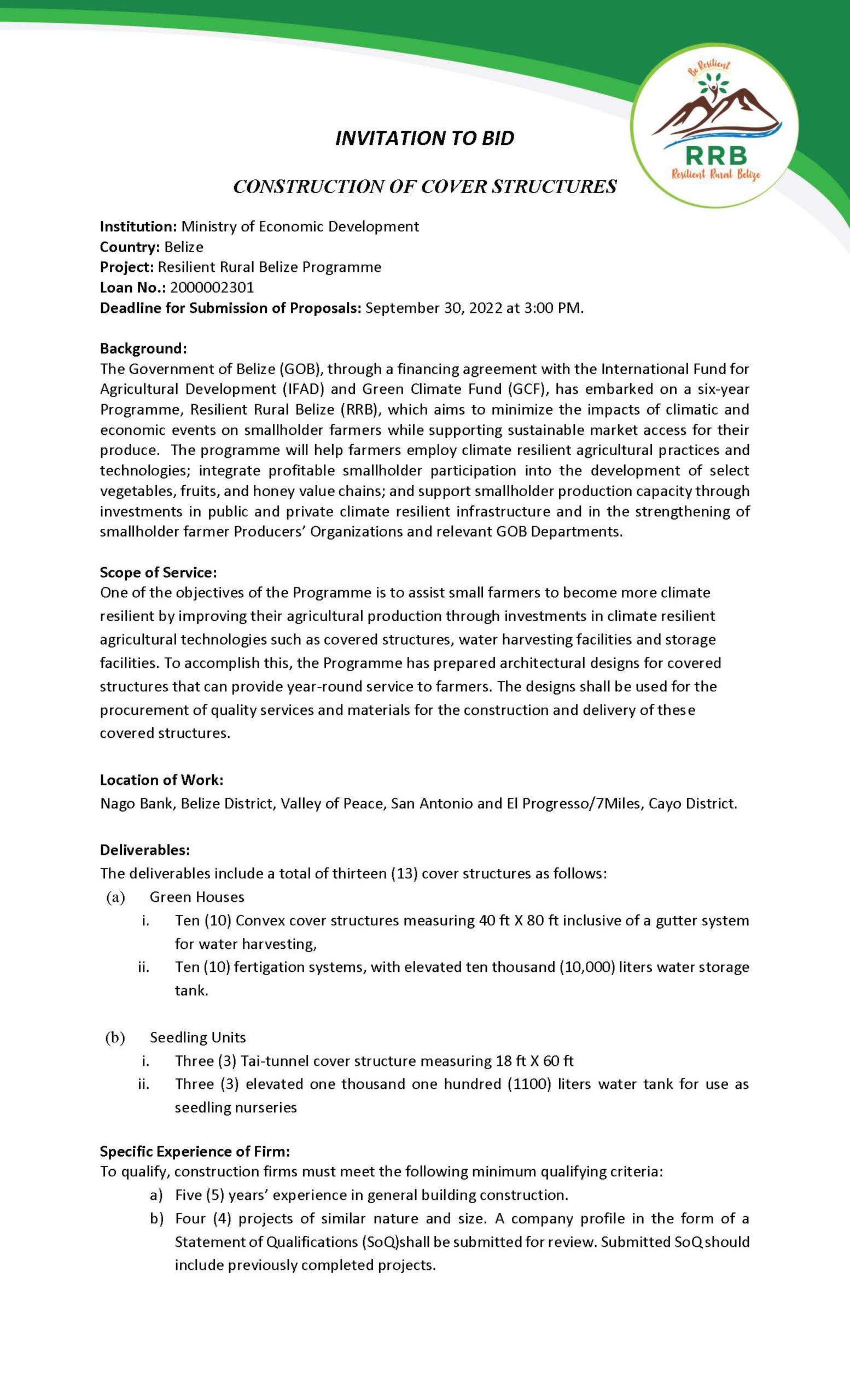 View Larger Image INVITATION TO BID – CONSTRUCTION OF COVER STRUCTURES m3d@dmin2022-08-31T14:01:59+00:00August 31st, 2022|Resilient Rural Belize| Share This Notification FacebookTwitterLinkedInWhatsAppEmail Related Posts REQUEST FOR BIDS July 1st, 2025 | 0 Comments REQUEST FOR BIDS December 17th, 2024 | 0 Comments REQUEST FOR BIDS December 17th, 2024 | 0 Comments