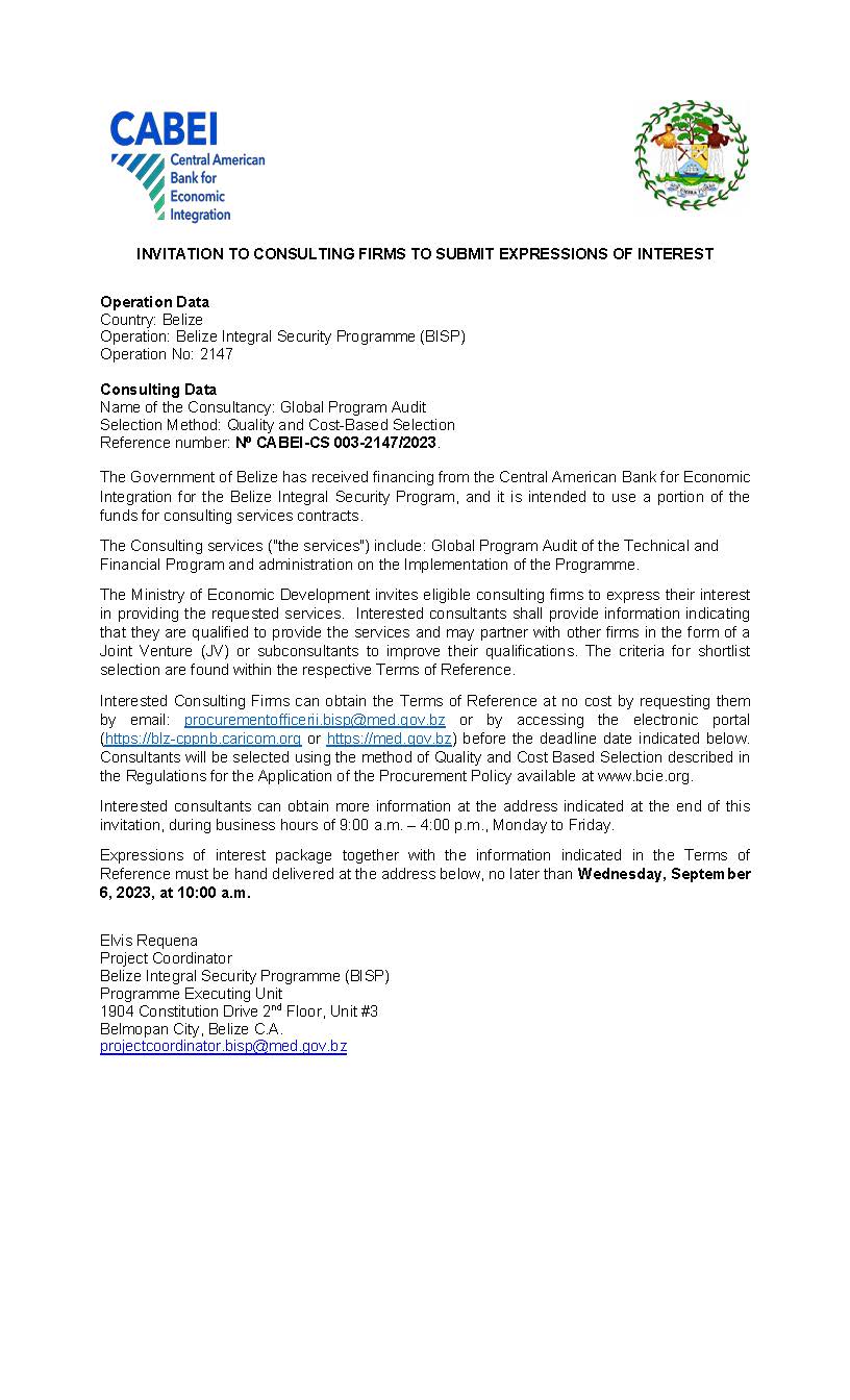 The Government of Belize has received financing from the Central American Bank for Economic Integration for the Belize Integral Security Program, and it is intended to use a portion of the funds for consulting services contracts.