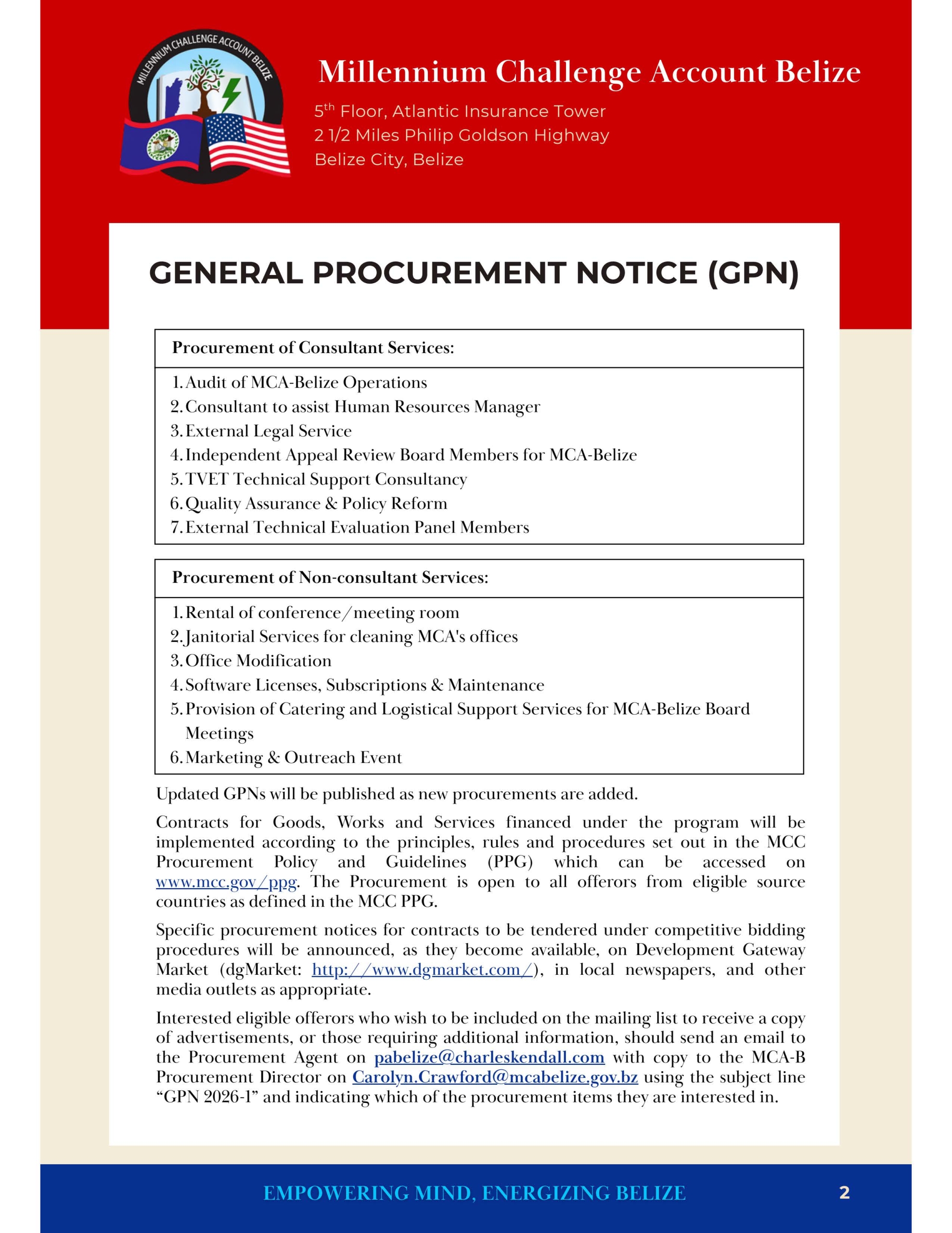 Millennium Challenge Account Belize General Procurement Notice