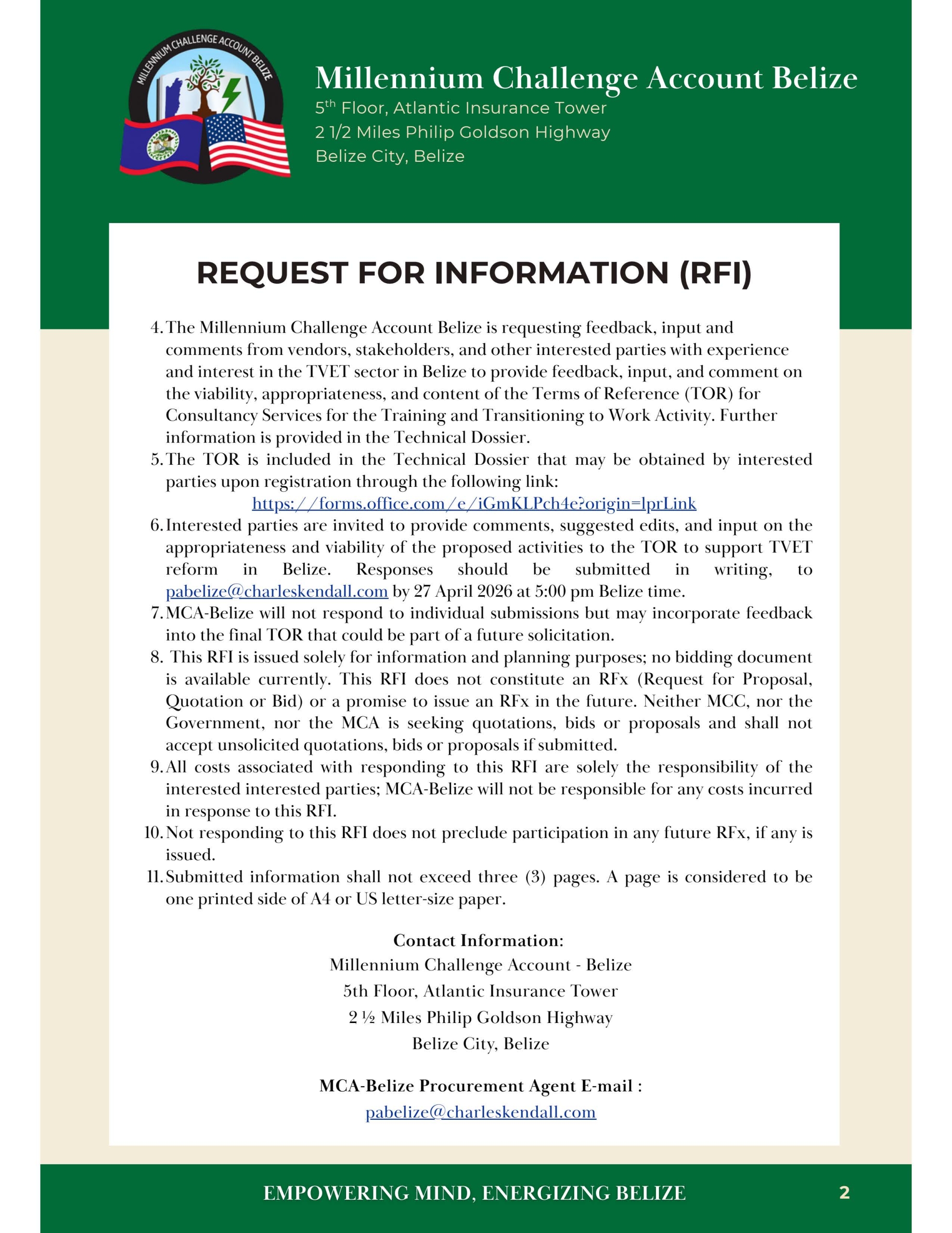 Millennium Challenge Account Belize Request For Information. Seeking Consultancy Services For The Training and Transitioning To Work Activity.