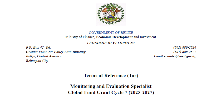 View Larger Image Monitoring and Evaluation Specialist Global Fund Grant Cycle 7 (2025-2027) Click on the link to download TOR. m3d@dmin2024-11-04T21:40:04+00:00November 4th, 2024|Consultancy Services, Global Fund, Ministry of Economic Development, Vacancies/Job Opportunities| Share This Notification FacebookTwitterLinkedInWhatsAppEmail Related Posts Response to Request for Clarification No. 1(MHIBFEWS.REOI.01.26) February 10th, 2026 | 0 Comments REQUEST FOR EXPRESSIONS OF INTEREST – FIRMS January 28th, 2026 | 0 Comments CONSULTANCY FOR PROCUREMENT OFFICER FOR THE BELIZE INTEGRAL SECURITY PROGRAMME (BISP) January 25th, 2026 | 0 Comments