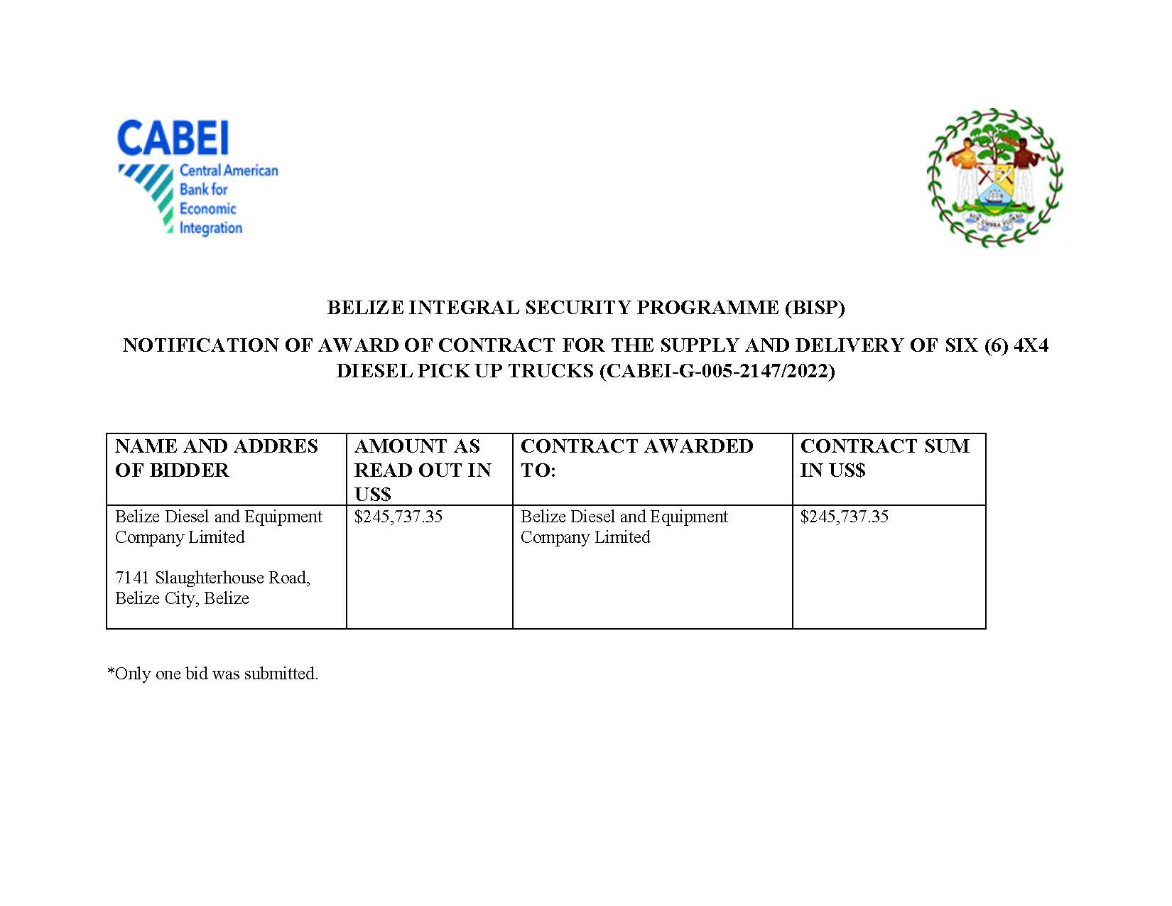 NOTIFICATION OF AWARD OF CONTRACT FOR THE SUPPLY AND DELIVERY OF SIX (6) 4X4 DIESEL PICK UP TRUCKS (CABEI-G-005-2147/2022)