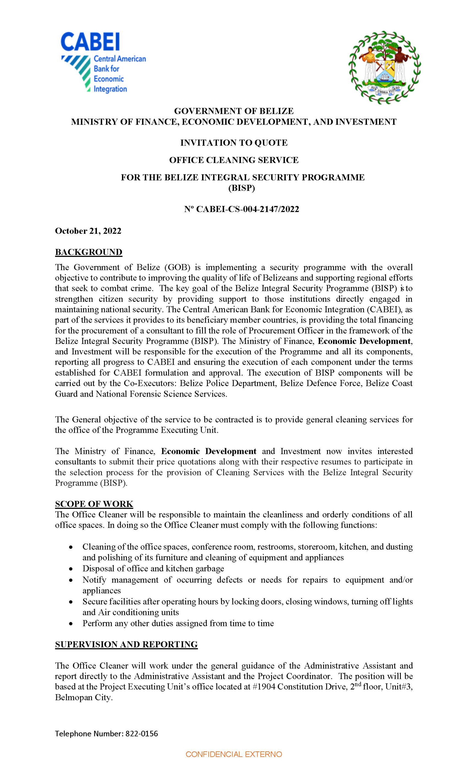The Ministry of Finance, Economic Development and Investment now invites interested consultants to submit their price quotations along with their respective resumes to participate in the selection process for the provision of Cleaning Services with the Belize Integral Security Programme (BISP).