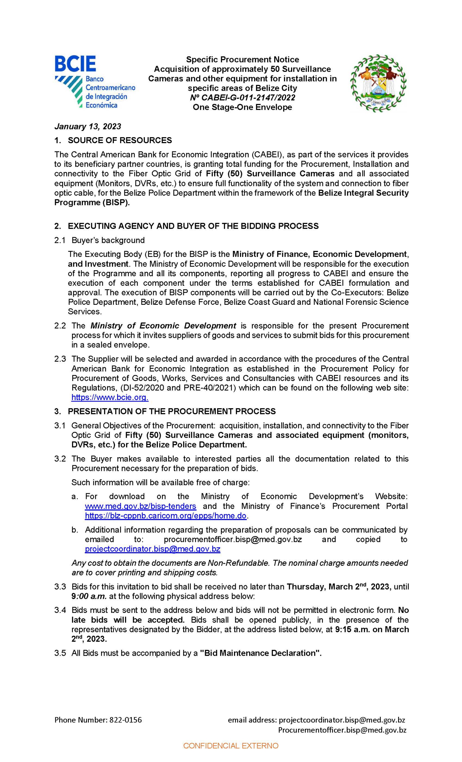 The Central American Bank for Economic Integration (CABEI), as part of the services it provides to its beneficiary partner countries, is granting total funding for the Procurement, Installation and connectivity to the Fiber Optic Grid of Fifty (50) Surveillance Cameras and all associated equipment (Monitors, DVRs, etc.) to ensure full functionality of the system and connection to fiber optic cable, for the Belize Police Department within the framework of the Belize Integral Security Programme (BISP).