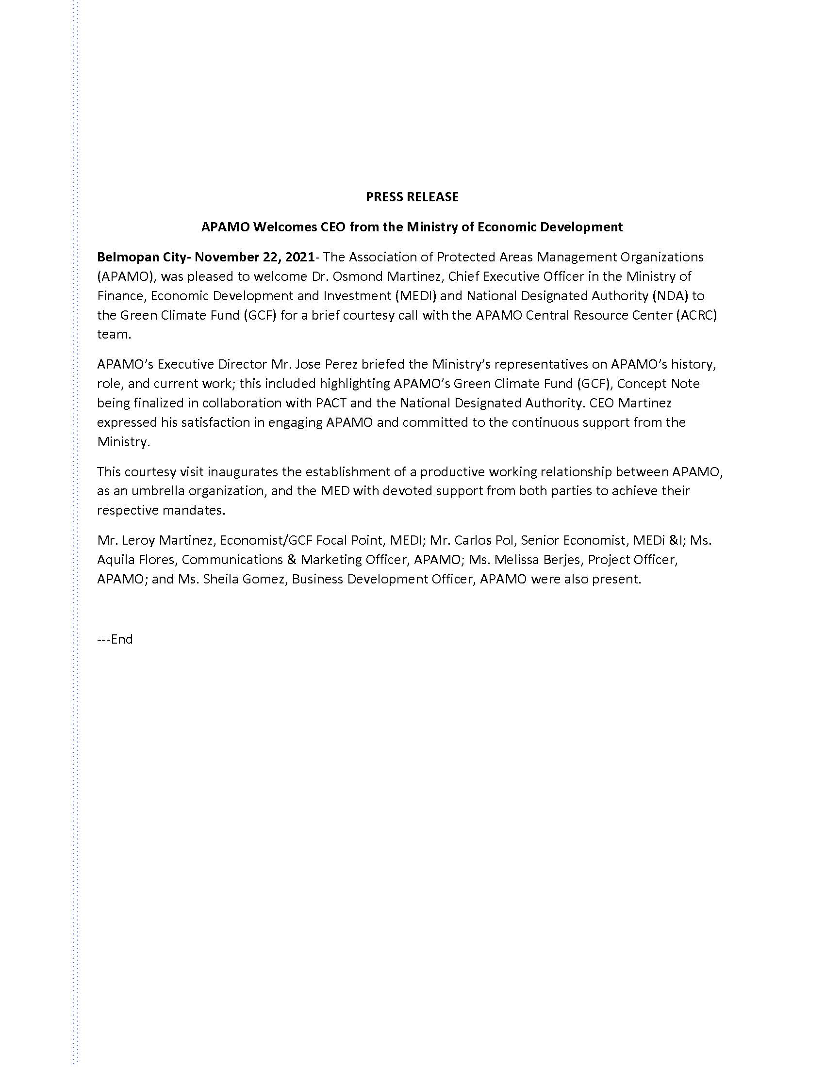 View Larger Image PRESS RELEASE – Association of Protected Areas Management Organizations Welcomes CEO from the Ministry of Economic Development m3d@dmin2021-11-26T02:22:21+00:00November 26th, 2021|National Authorizing Office, Press Release| Share This Notification FacebookTwitterLinkedInWhatsAppEmail Related Posts Project – Traditional Savanna Fire Management to facilitate Emissions Reductions in the AFOLU sector in Belize- DEADLINE EXTENDED November 8th, 2022 | 0 Comments PRESS RELEASE- Belize High-Level Delegation Participates in GCF Global Conference in Korea September 15th, 2022 | 0 Comments The National Forensic Science Service received first-of-its-kind FT-IR Laboratory Equipment in Belize! September 7th, 2022 | 0 Comments