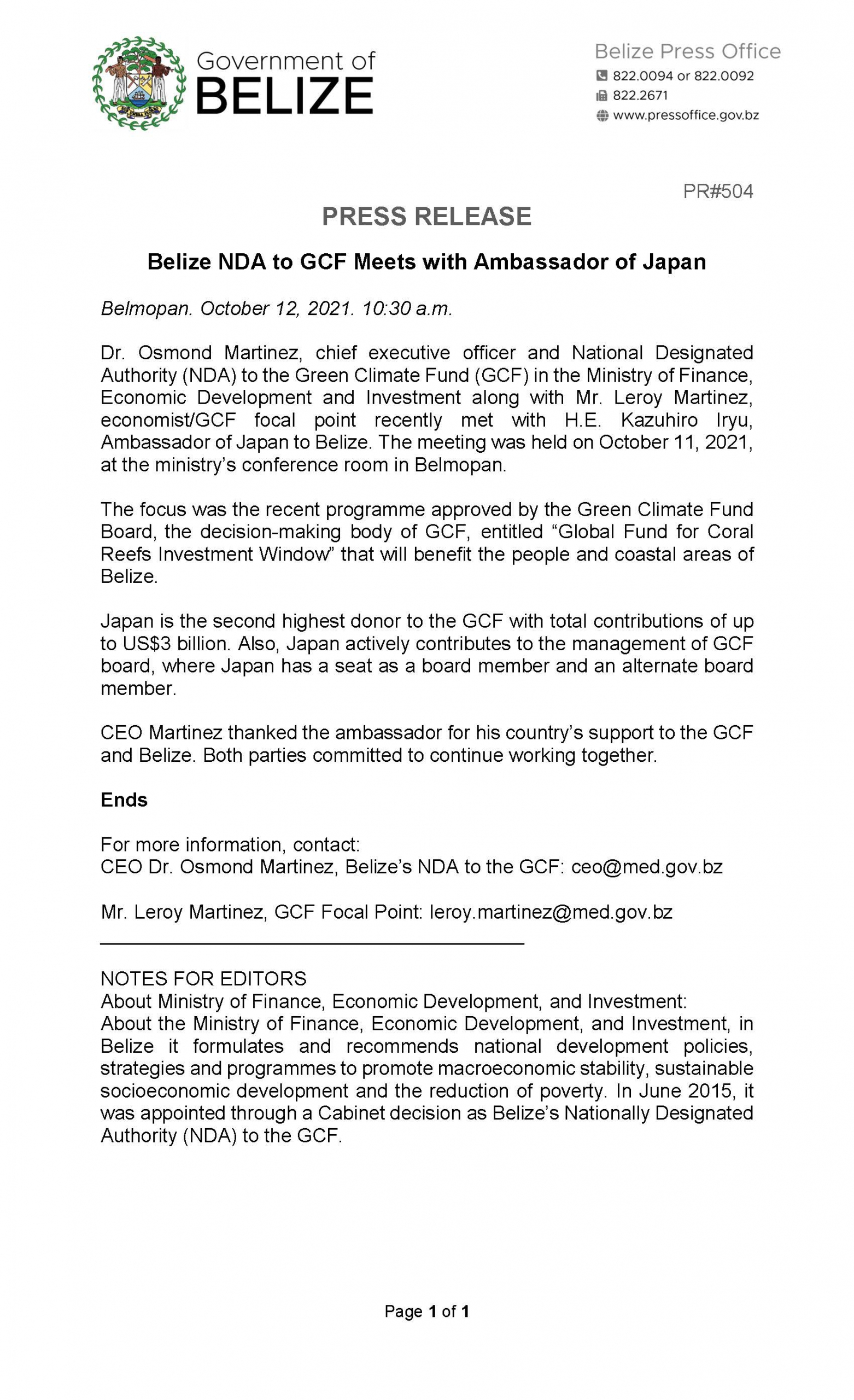 PRESS RELEASE – Belize NDA to GCF Meets with Ambassador of Japan