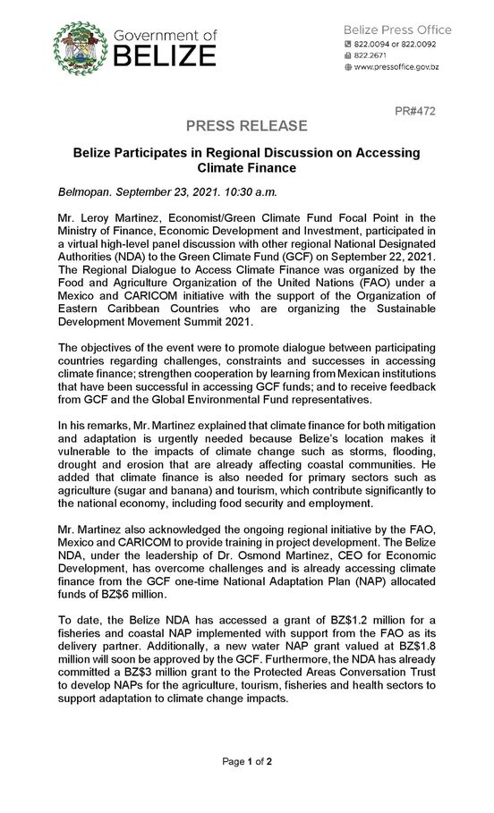 View Larger Image PRESS RELEASE – Belize Participates in Regional Discussion on Accessing Climate Finance m3d@dmin2021-09-24T15:41:43+00:00September 24th, 2021|Economic Development, National Designated Authority, Press Release| Share This Notification FacebookTwitterLinkedInWhatsAppEmail Related Posts CONSULTANCY FOR PROCUREMENT OFFICER FOR THE BELIZE INTEGRAL SECURITY PROGRAMME (BISP) January 25th, 2026 | 0 Comments REQUEST FOR EXPRESSIONS OF INTEREST – Consulting Firm December 29th, 2025 | 0 Comments REQUEST FOR EXPRESSIONS OF INTEREST – FIRMS November 17th, 2025 | 0 Comments