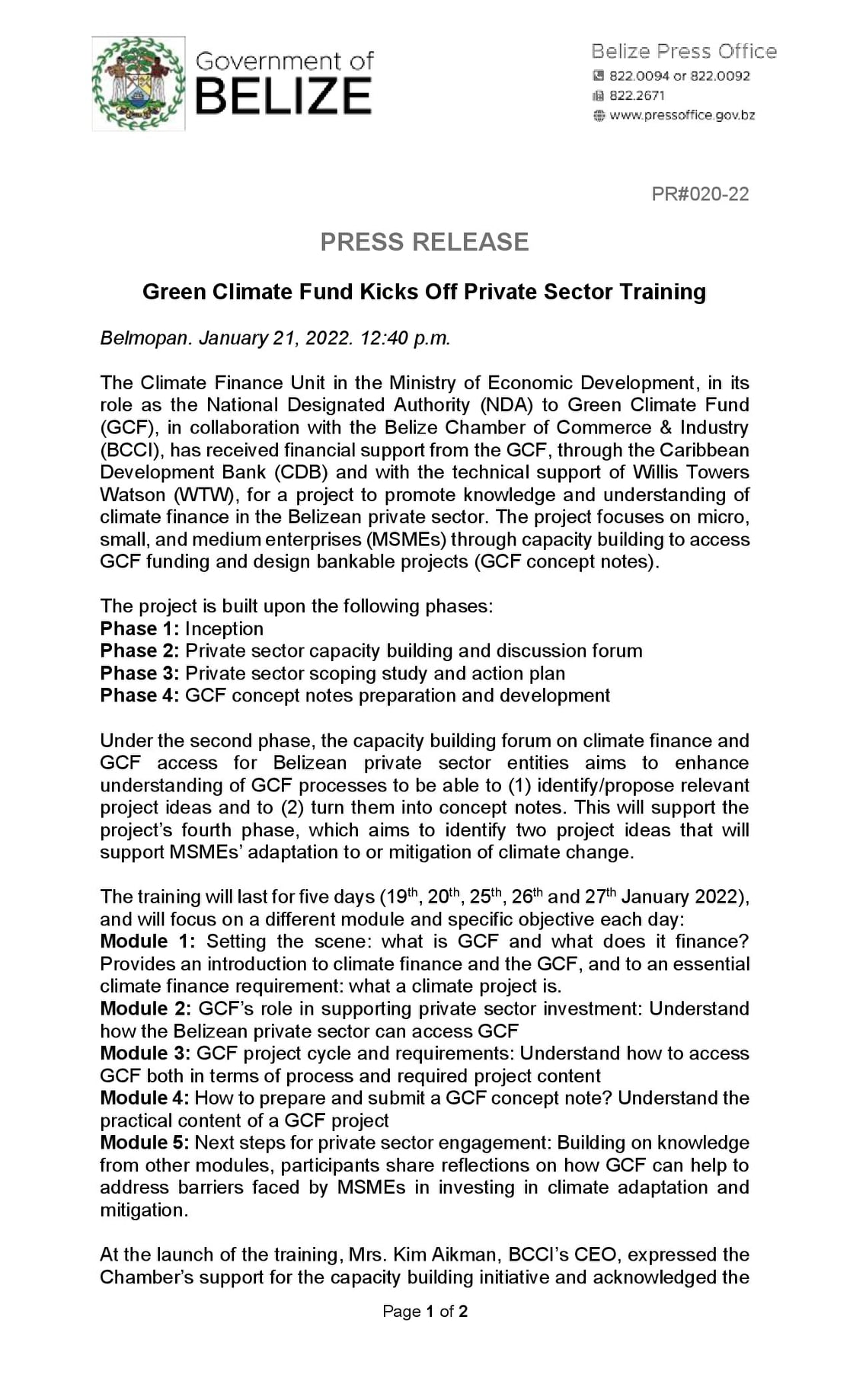 View Larger Image PRESS RELEASE – Green Climate Fund Kicks Off Private Sector Training m3d@dmin2022-01-21T19:15:27+00:00January 21st, 2022|Economic Development, National Designated Authority, Press Release| Share This Notification FacebookTwitterLinkedInWhatsAppEmail Related Posts CONSULTANCY FOR PROCUREMENT OFFICER FOR THE BELIZE INTEGRAL SECURITY PROGRAMME (BISP) January 25th, 2026 | 0 Comments REQUEST FOR EXPRESSIONS OF INTEREST – Consulting Firm December 29th, 2025 | 0 Comments REQUEST FOR EXPRESSIONS OF INTEREST – FIRMS November 17th, 2025 | 0 Comments