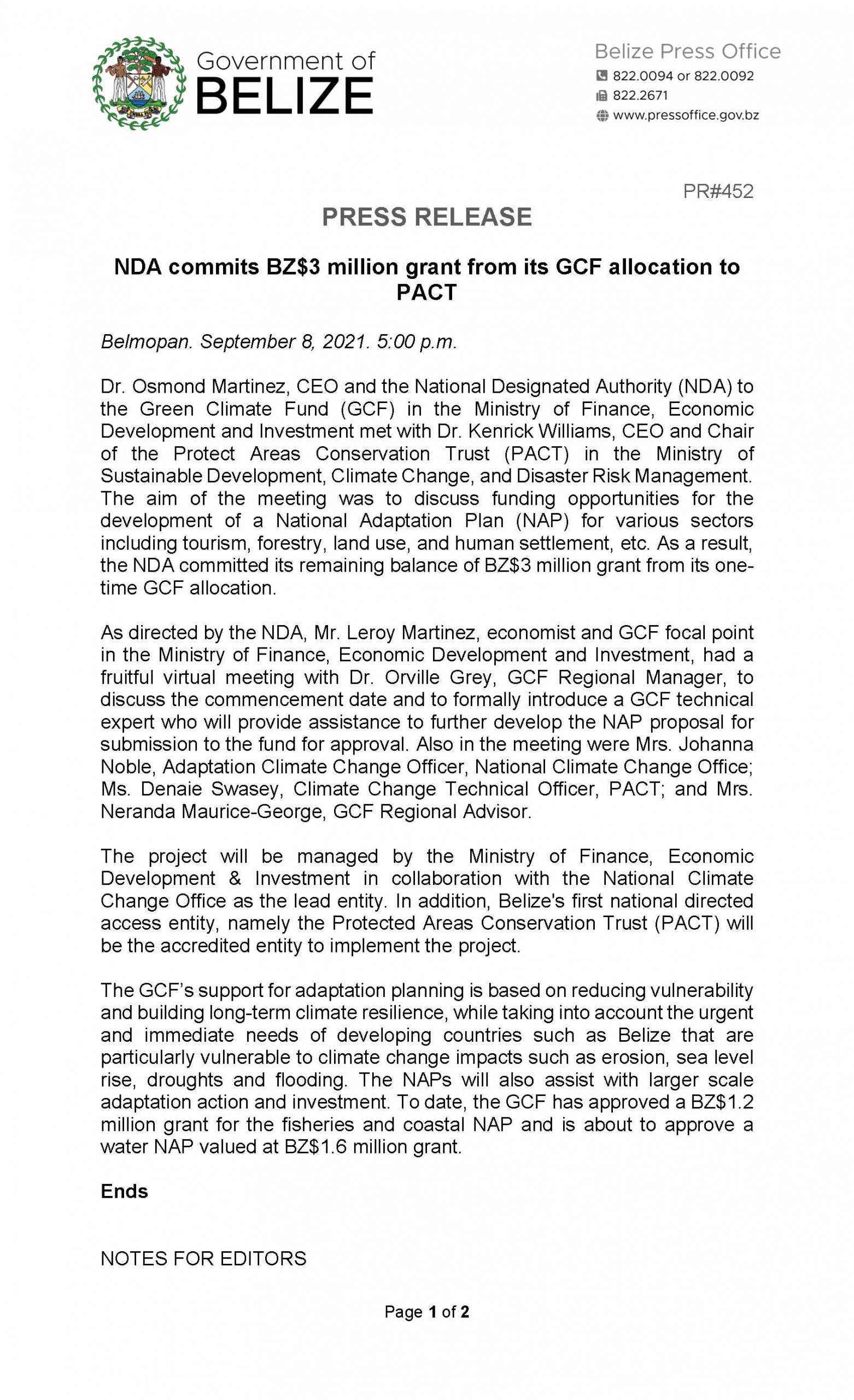 View Larger Image PRESS RELEASE NDA commits BZ$3 million grant from its GCF allocation to PACT m3d@dmin2021-09-09T15:42:45+00:00September 9th, 2021|Economic Development, National Designated Authority, Press Release| Share This Notification FacebookTwitterLinkedInWhatsAppEmail Related Posts CONSULTANCY FOR PROCUREMENT OFFICER FOR THE BELIZE INTEGRAL SECURITY PROGRAMME (BISP) January 25th, 2026 | 0 Comments REQUEST FOR EXPRESSIONS OF INTEREST – Consulting Firm December 29th, 2025 | 0 Comments REQUEST FOR EXPRESSIONS OF INTEREST – FIRMS November 17th, 2025 | 0 Comments