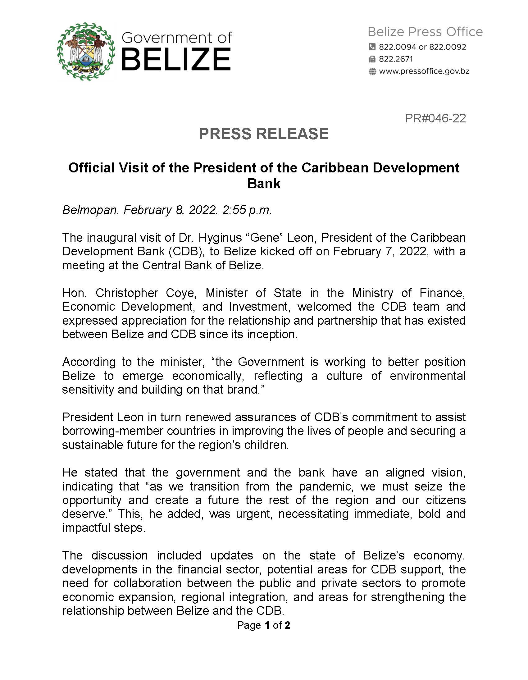 View Larger Image PRESS RELEASE – Official Visit of the President of the Caribbean Development Bank m3d@dmin2022-02-09T13:59:45+00:00February 9th, 2022|Economic Development, Press Release| Share This Notification FacebookTwitterLinkedInWhatsAppEmail Related Posts CONSULTANCY FOR PROCUREMENT OFFICER FOR THE BELIZE INTEGRAL SECURITY PROGRAMME (BISP) January 25th, 2026 | 0 Comments REQUEST FOR EXPRESSIONS OF INTEREST – Consulting Firm December 29th, 2025 | 0 Comments REQUEST FOR EXPRESSIONS OF INTEREST – FIRMS November 17th, 2025 | 0 Comments