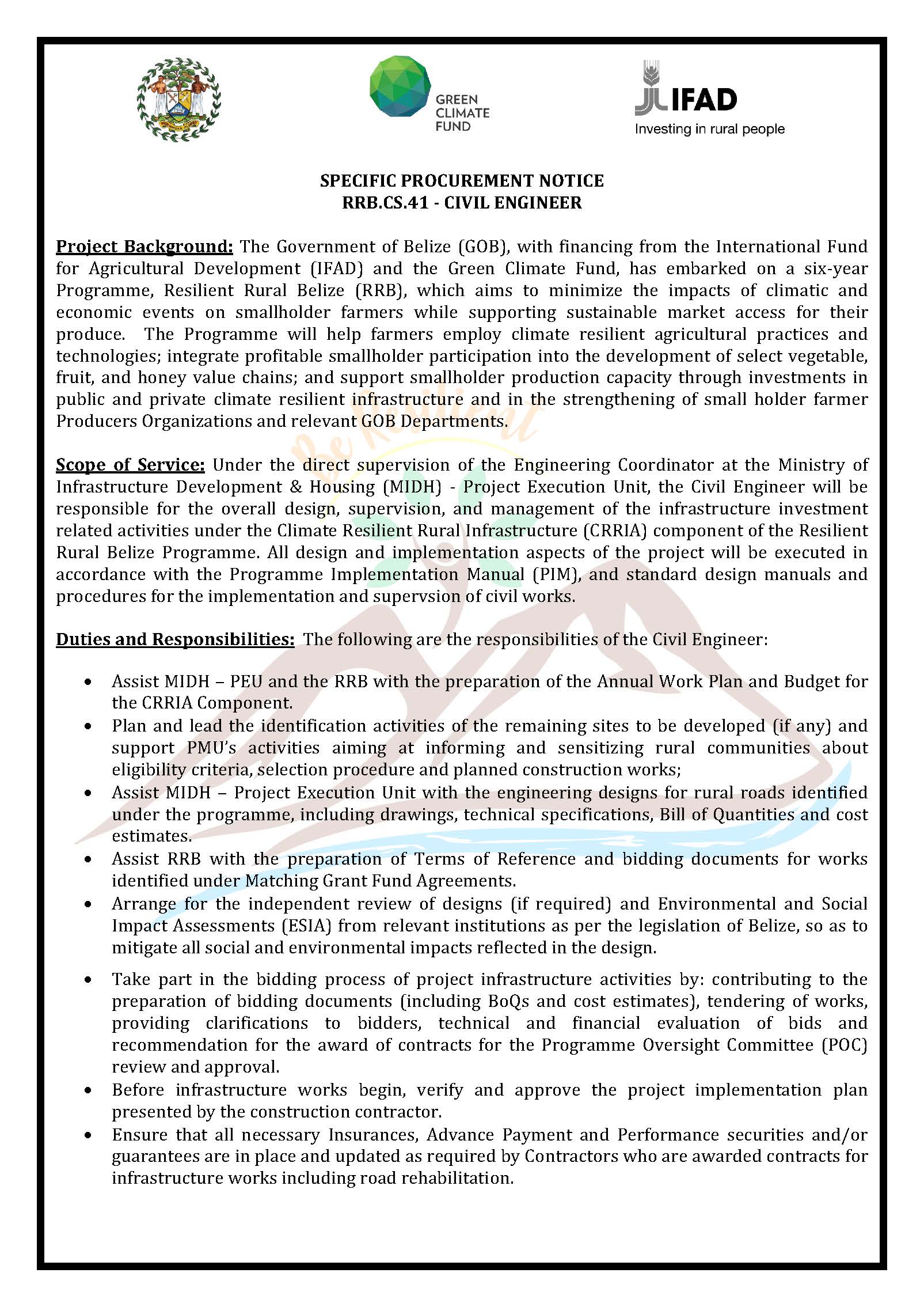 View Larger Image PROCUREMENT NOTICE – CIVIL ENGINEER m3d@dmin2021-11-16T17:47:51+00:00November 16th, 2021|Resilient Rural Belize, Vacancies/Job Opportunities| Share This Notification FacebookTwitterLinkedInWhatsAppEmail Related Posts REQUEST FOR EXPRESSIONS OF INTEREST – Program Manager December 19th, 2025 | 0 Comments REQUEST FOR EXPRESSIONS OF INTEREST – DRIVER December 18th, 2025 | 0 Comments VACANCY NOTICE – ONE (1) Managing Director, Energy Project Millennium Challenge Account-Belize (MCA-Belize) December 3rd, 2025 | 0 Comments