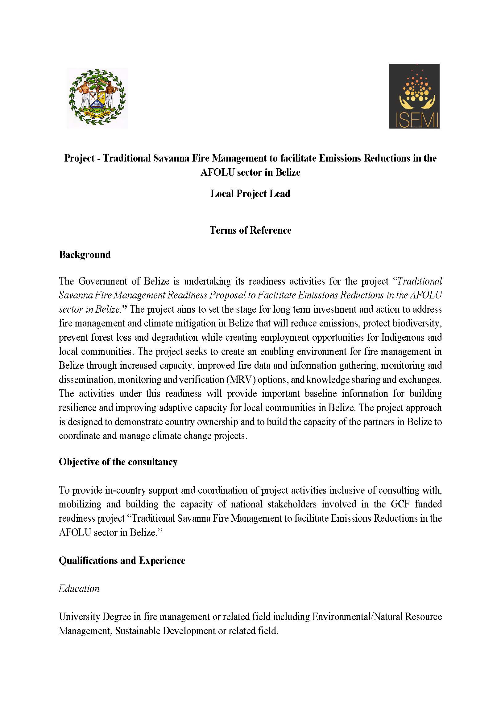 To provide in-country support and coordination of project activities inclusive of consulting with, mobilizing and building the capacity of national stakeholders involved in the GCF funded readiness project “Traditional Savanna Fire Management to facilitate Emissions Reductions in the AFOLU sector in Belize.”