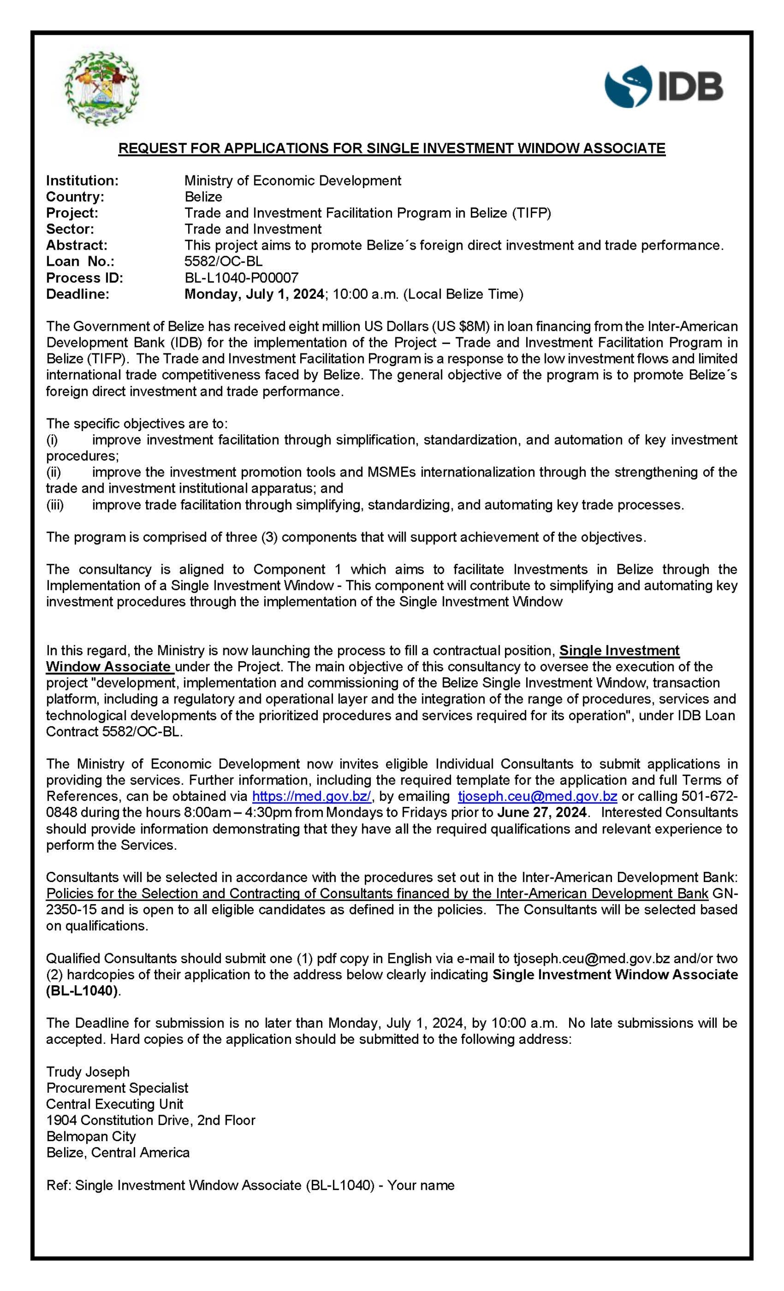 Deadline: Extended to Wednesday, July 17, 2024; 10:00 a.m. (Local Belize Time)