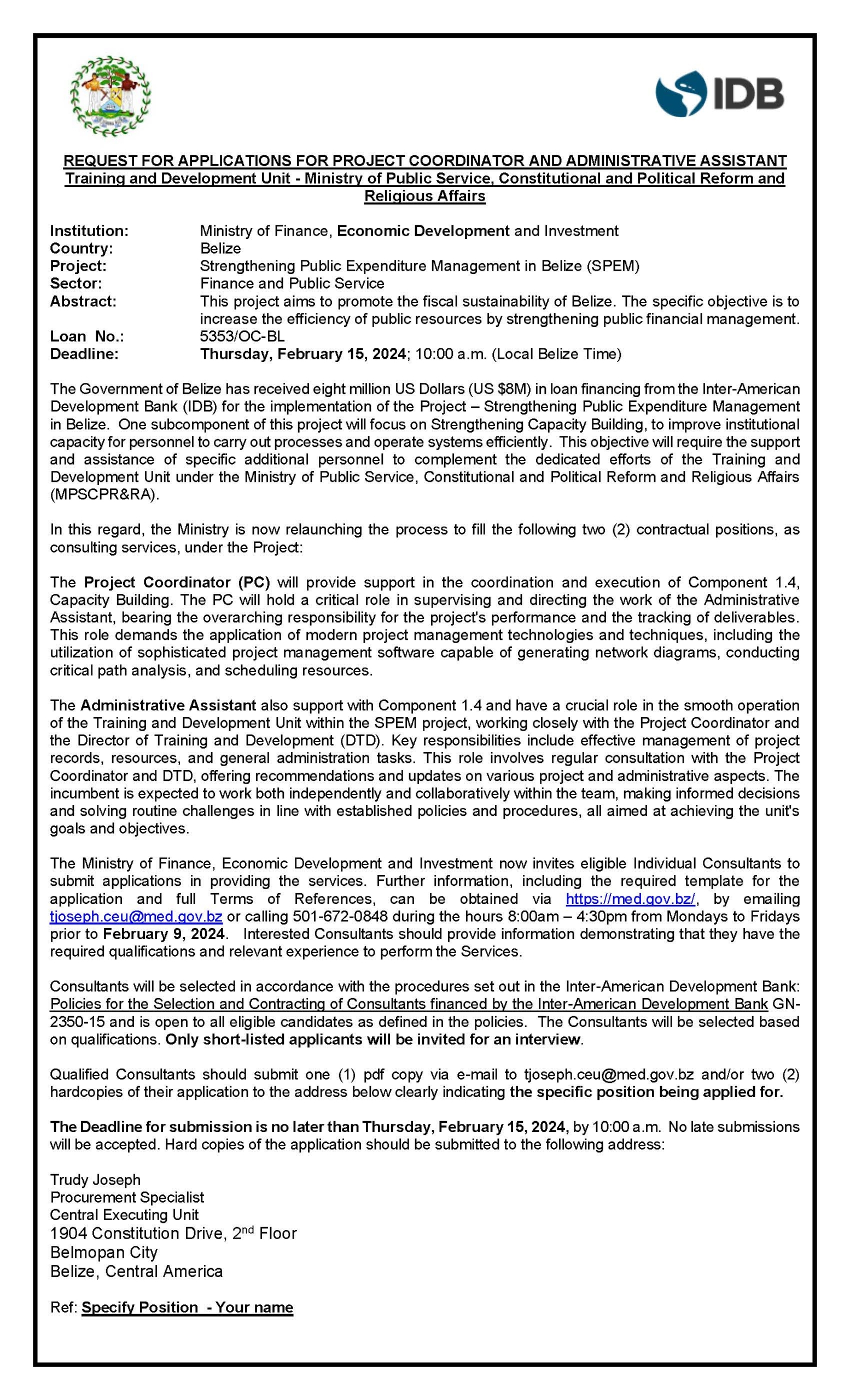 The deadline for submission is Thursday, February 15, 2024; 10:00 a.m. (Local Belize Time)