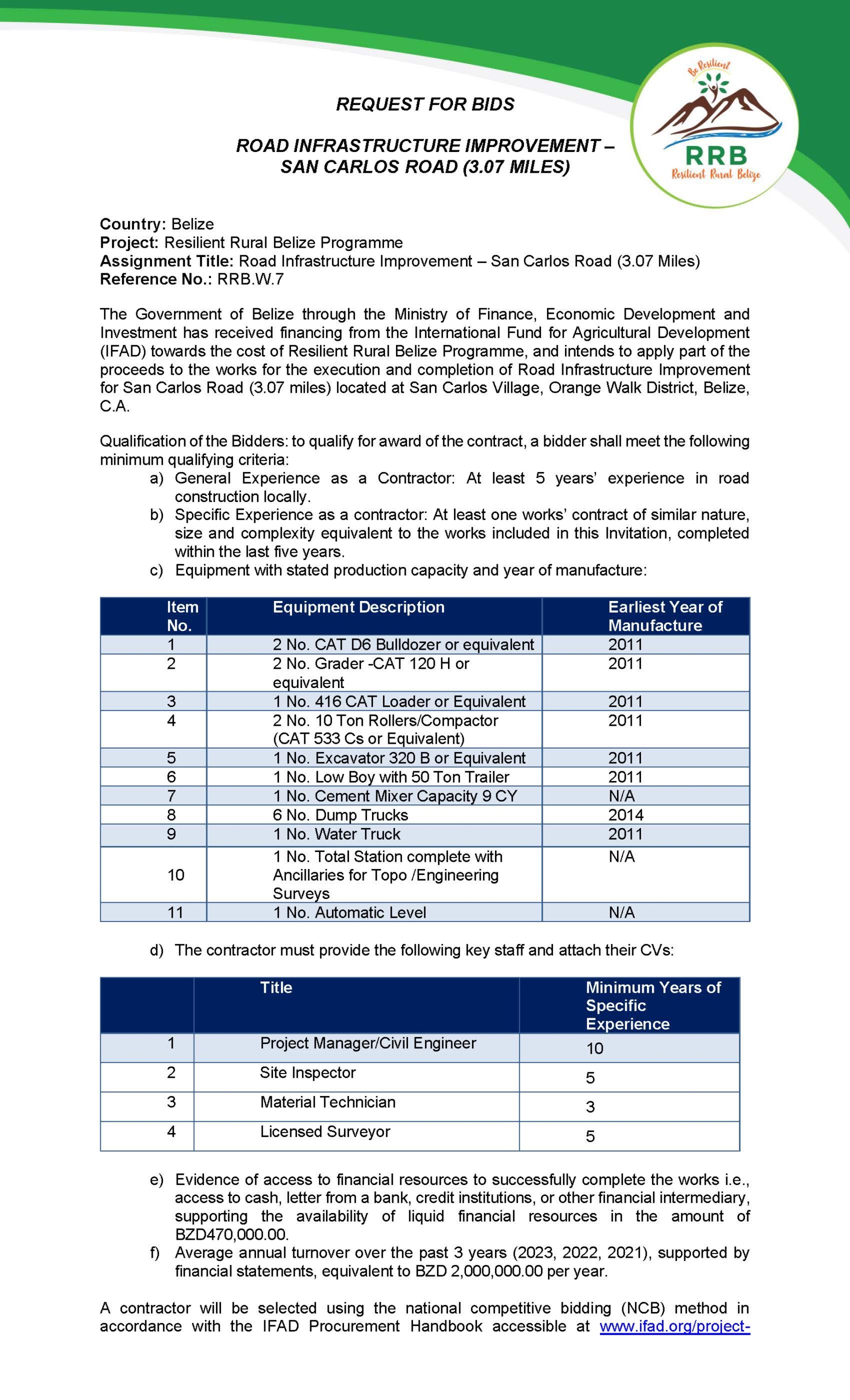 The Government of Belize through the Ministry of Finance, Economic Development and Investment has received financing from the International Fund for Agricultural Development (IFAD) towards the cost of Resilient Rural Belize Programme, and intends to apply part of the proceeds to the works for the execution and completion of Road Infrastructure Improvement for San Carlos Road (3.07 miles) located at San Carlos Village, Orange Walk District, Belize, C.A.