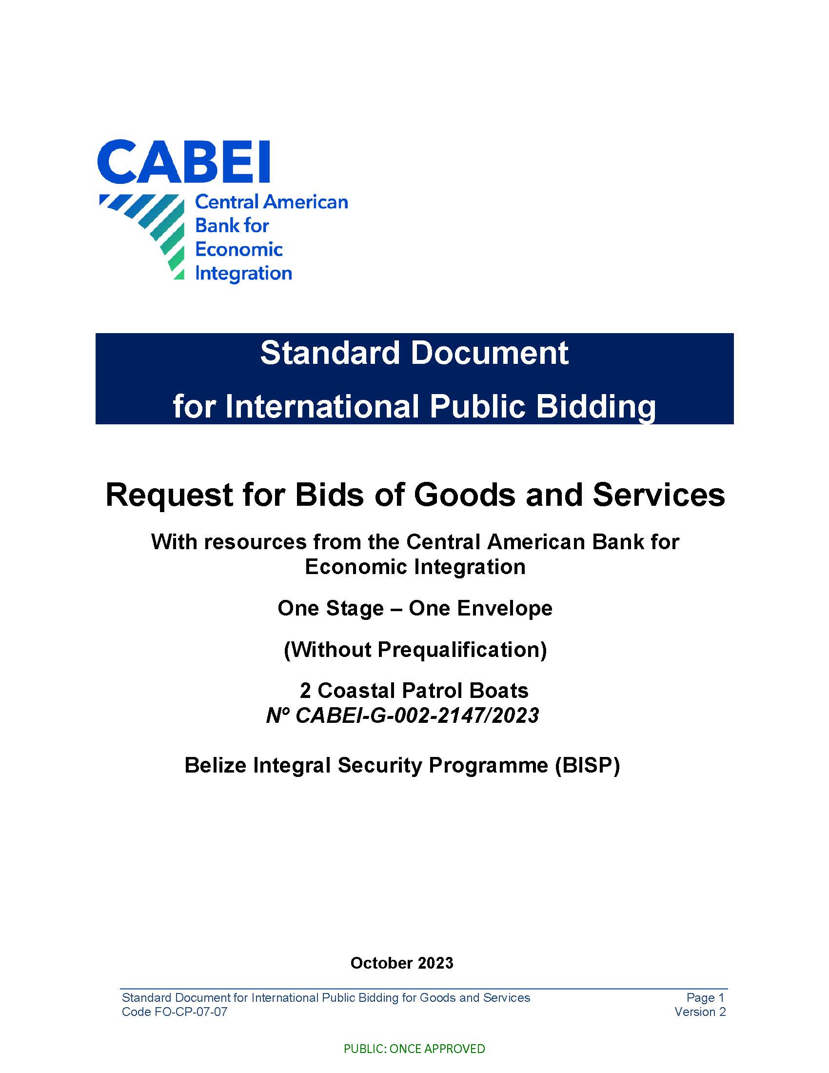 View Larger Image Request for Bids of Goods and Services With resources from the Central American Bank for Economic Integration One Stage – One Envelope (Without Prequalification) 2 Coastal Patrol Boats Nº CABEI-G-002-2147/2023 Belize Integral Security Programme (BISP) Click below to download the Bid document. m3d@dmin2023-12-20T19:31:02+00:00December 20th, 2023|Bid Opportunity, CABEI| Share This Notification FacebookTwitterLinkedInWhatsAppEmail Related Posts GENERAL PROCUREMENT NOTICE (GPN) February 6th, 2026 | 0 Comments SPECIFIC PROCUREMENT NOTICE (SPN) February 6th, 2026 | 0 Comments Request for Bids – Specific Procurement Notice (North CCC and BMHS)extended January 30th, 2026 | 0 Comments