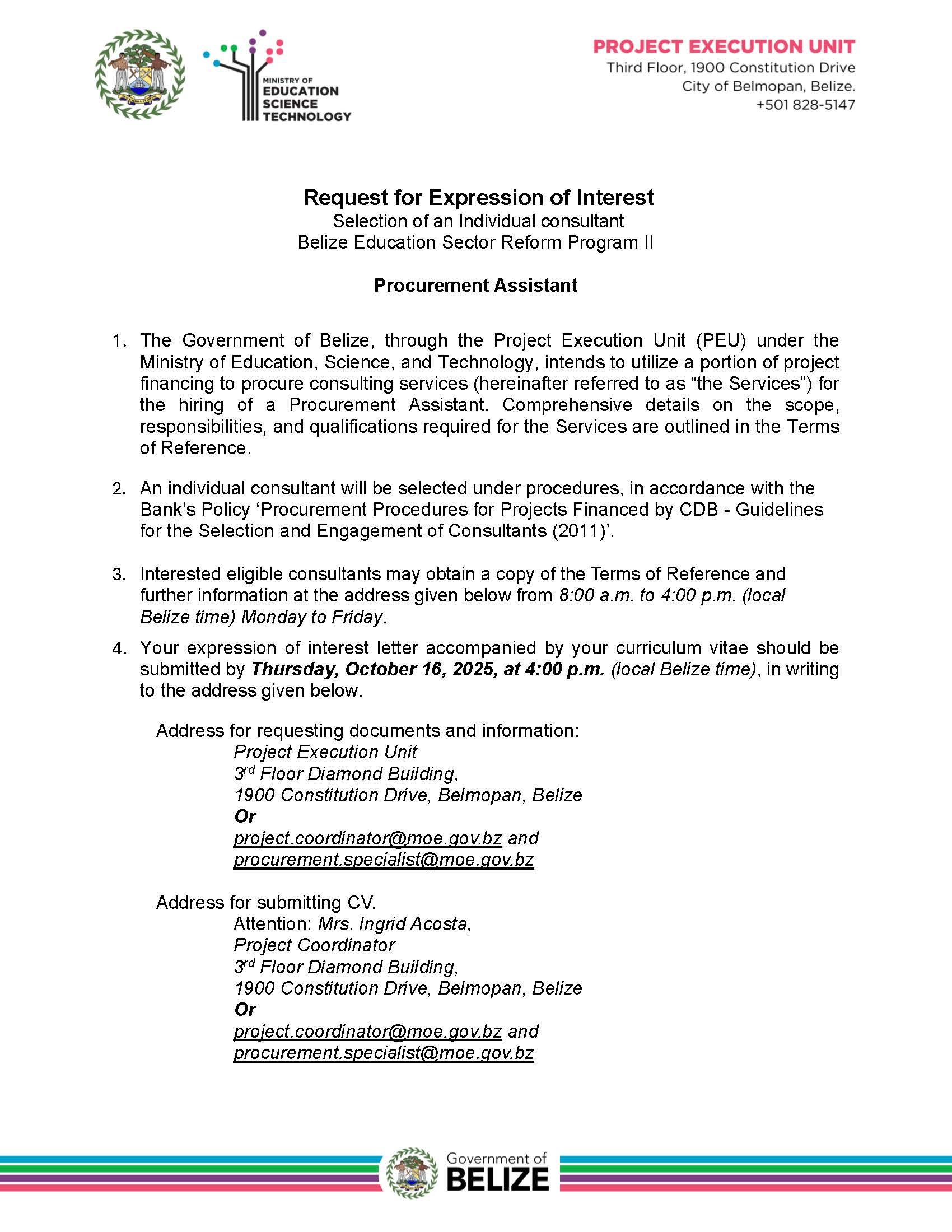 View Larger Image Request for Expression of Interest Joel Ical2025-10-03T14:46:12+00:00October 3rd, 2025|CDB, Notices, Vacancies/Job Opportunities| Share This Notification FacebookTwitterLinkedInWhatsAppEmail Related Posts Response to Request for Clarification No. 1(MHIBFEWS.REOI.01.26) February 10th, 2026 | 0 Comments SPECIFIC PROCUREMENT NOTICE (SPN) February 6th, 2026 | 0 Comments REQUEST FOR EXPRESSIONS OF INTEREST – FIRMS January 28th, 2026 | 0 Comments