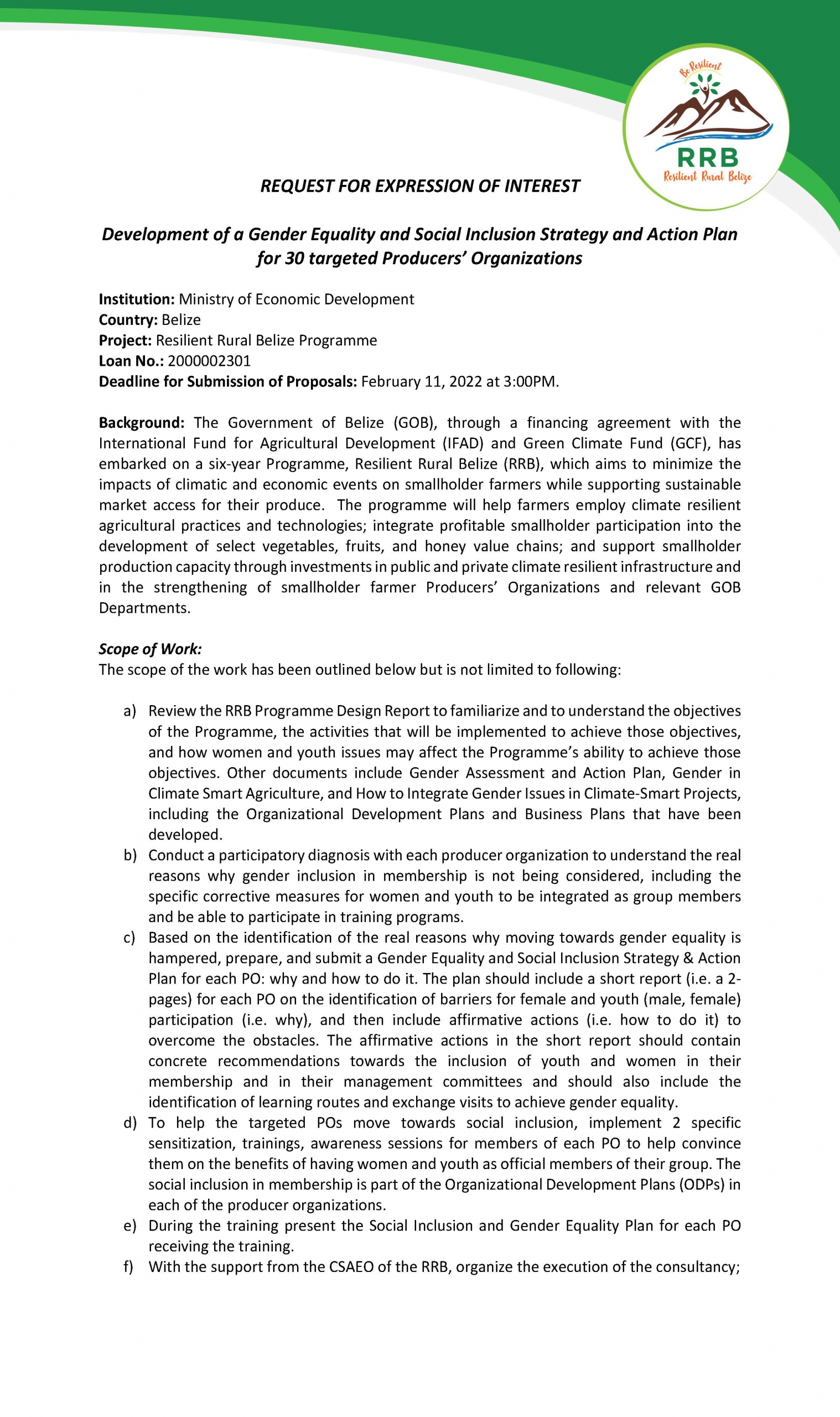 REQUEST FOR EXPRESSION OF INTEREST – Development of a Gender Equality and Social Inclusion Strategy and Action Plan for 30 targeted Producers’ Organizations