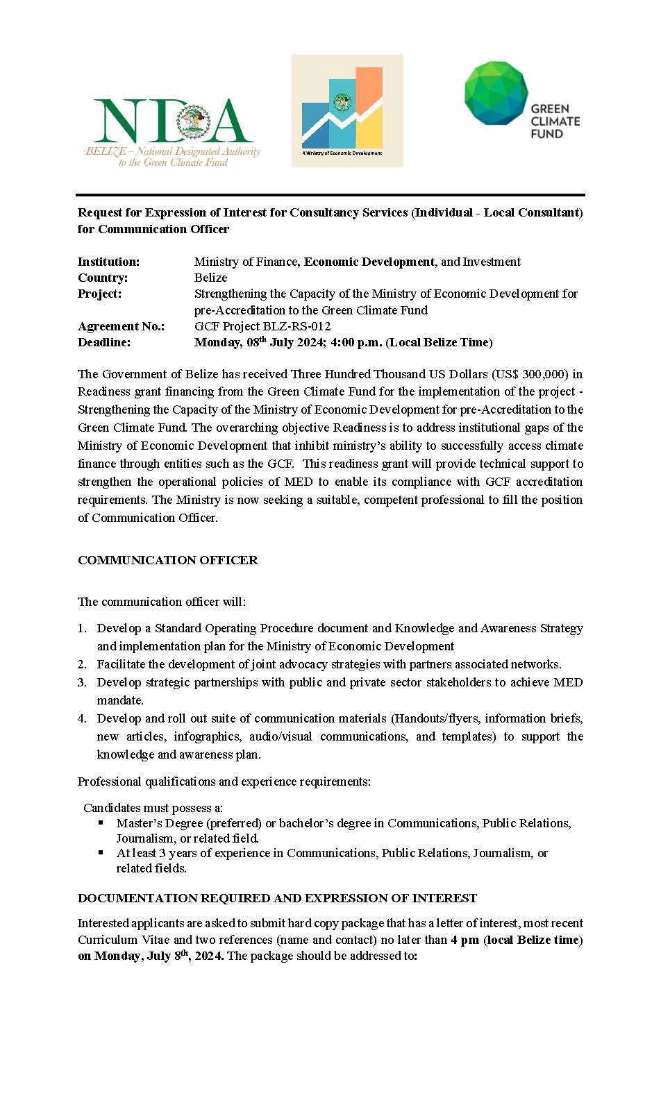 Deadline: Monday, 08th July 2024; 4:00 p.m. (Local Belize Time)