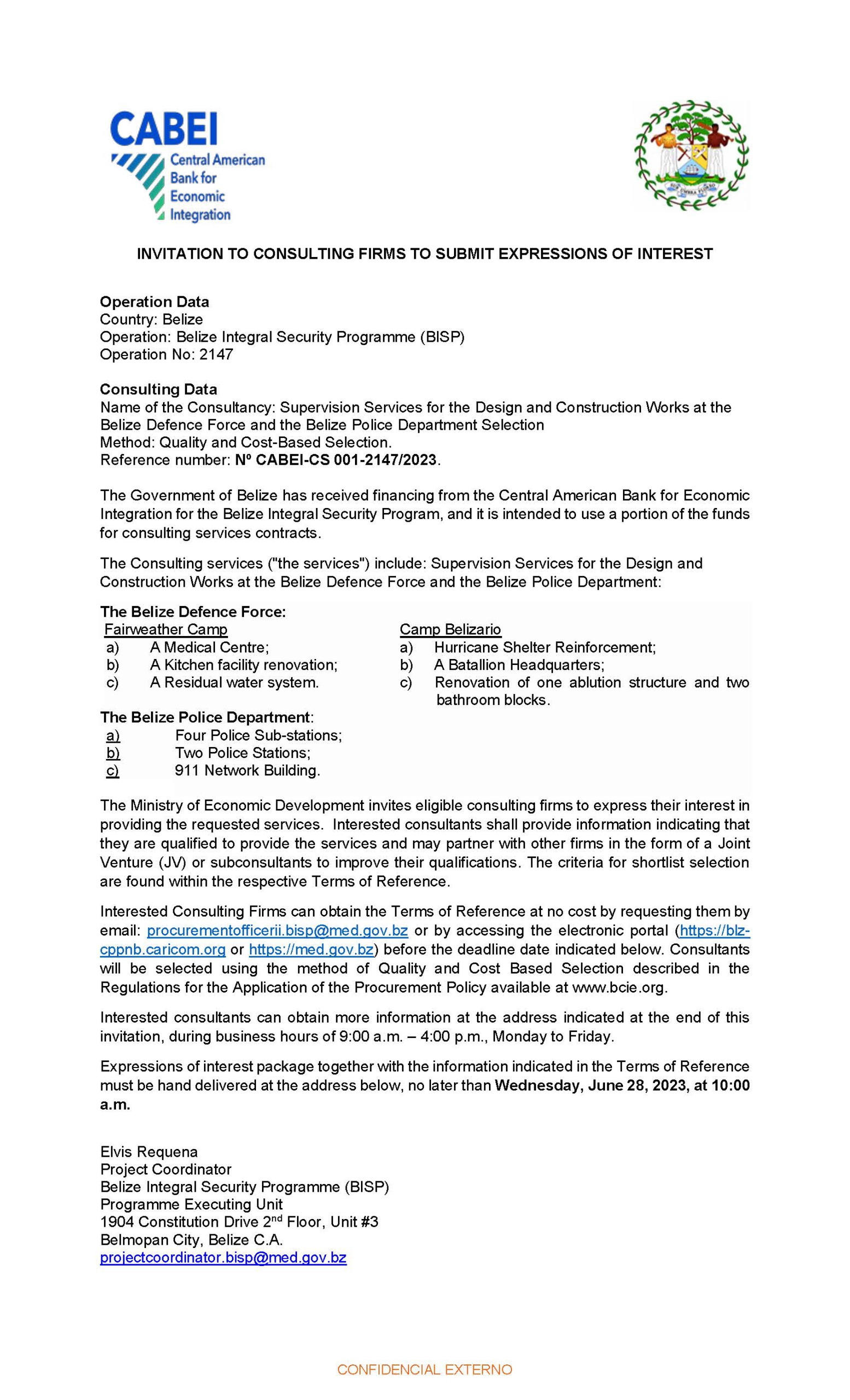 Name of the Consultancy: Supervision Services for the Design and Construction Works at the Belize Defence Force and the Belize Police Department Selection