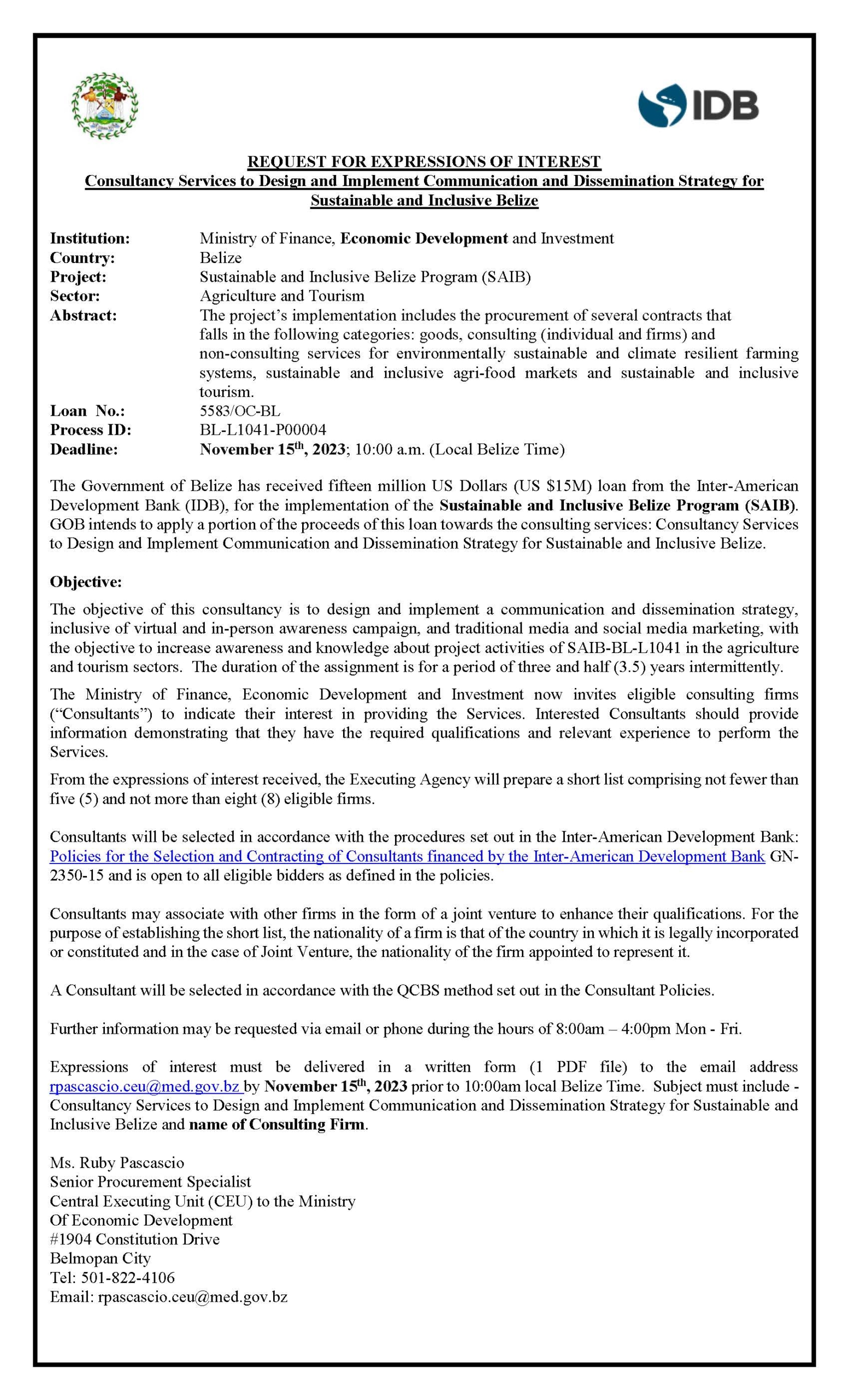 Deadline: November 15th, 2023; 10:00 a.m. (Local Belize Time)