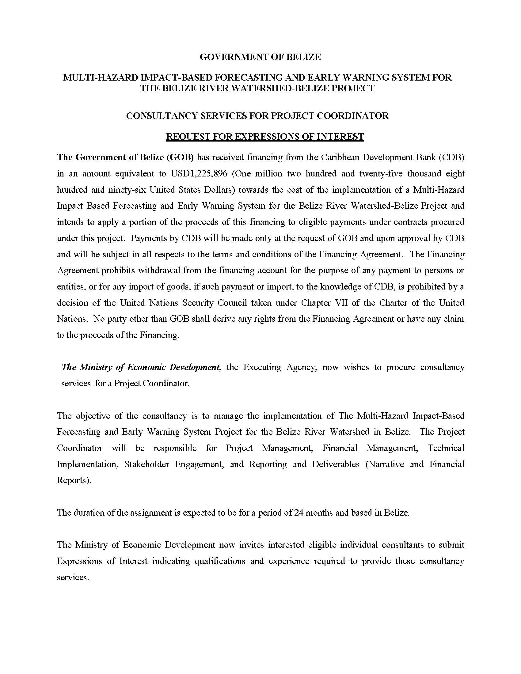 An electronic copy of the Expressions of Interest must be received at the following two addresses below no later than (4:00 pm (Belize Time) on Friday, April 15, 2024). The subject line should read “Expression of Interest – Consultancy Services for Project Coordinator”.