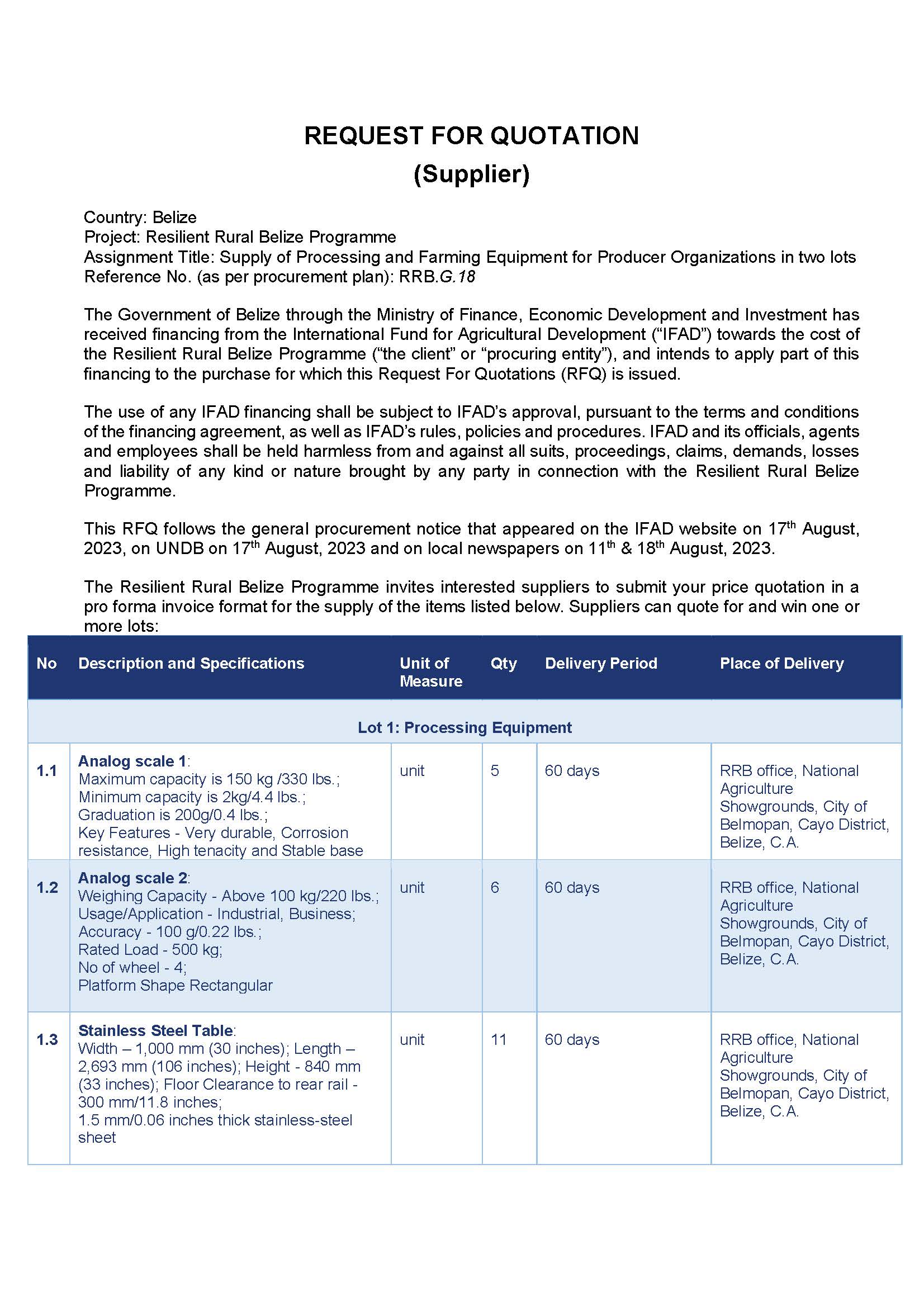 Suppliers interested in receiving the completed Request for Quotation (RRQ) document should register their interest by sending an e-mail (with subject: Request for RFQ – Supply of Processing and Farming Equipment for POs in two lots to the address below.