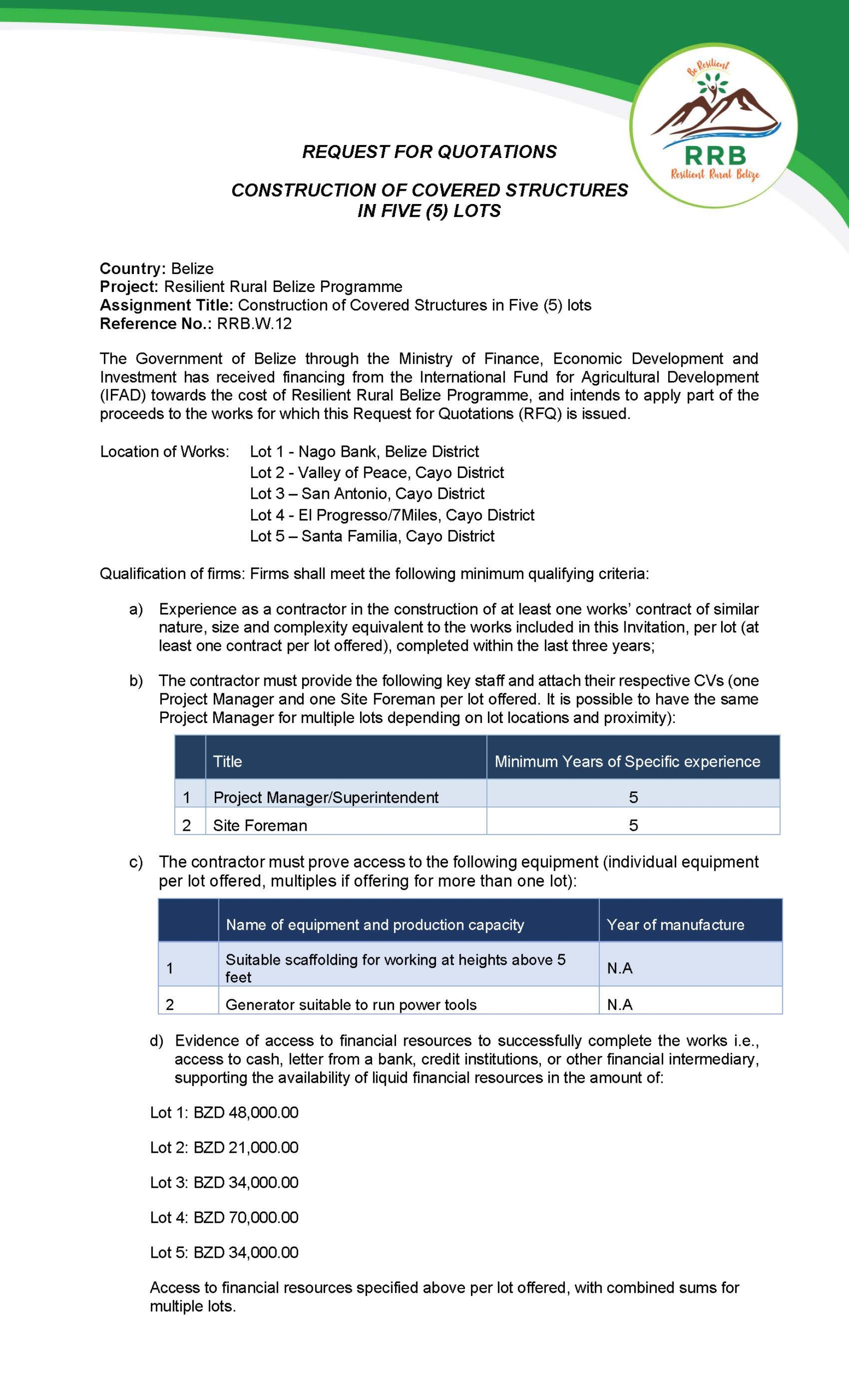 The Government of Belize through the Ministry of Finance, Economic Development and Investment has received financing from the International Fund for Agricultural Development (IFAD) towards the cost of Resilient Rural Belize Programme, and intends to apply part of the proceeds to the works for which this Request for Quotations (RFQ) is issued.