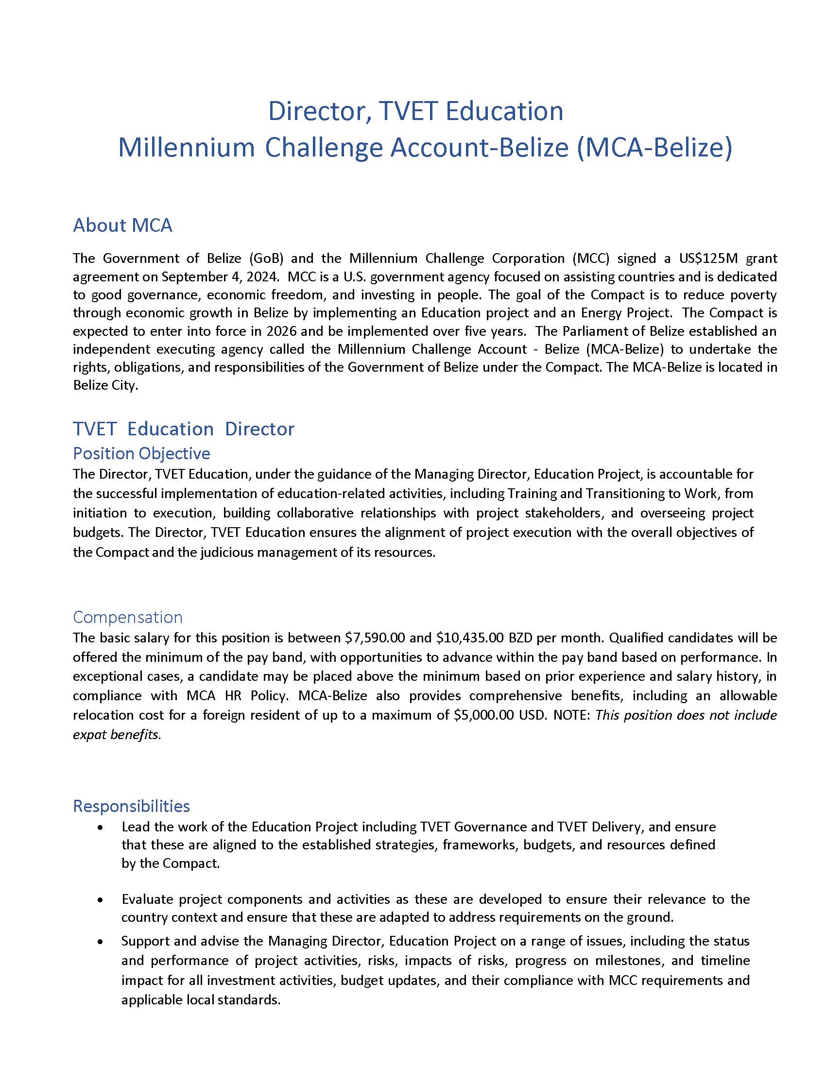 VACANCY NOTICE – ONE (1) Director, TVET Education Millennium Challenge Account-Belize (MCA-Belize)